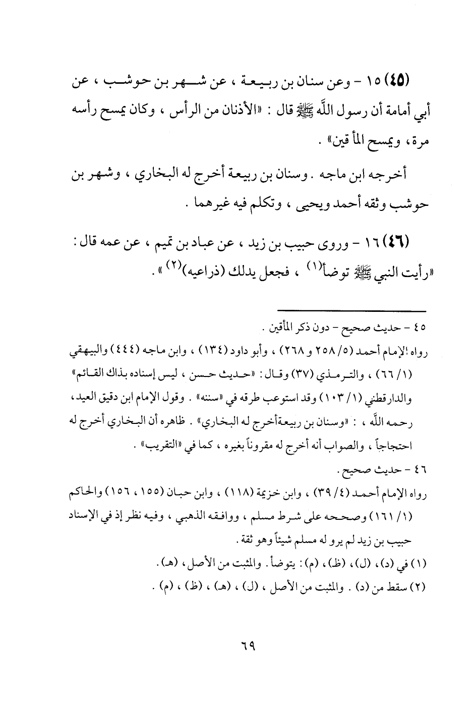(45) وَعَن سِنَان بن ربيعَة، عَن شهر بن حَوْشَب، عَن أبي أُمَامَة أَن رَسُول الله [صَلَّى اللَّهُ عَلَيْهِ وَسَلَّم َ] قَالَ: " الأذنان من الرَّأْس، وَكَانَ يمسح رَأسه مرّة، وَيمْسَح المأقين ". أخرجه ابْن ماجة. وَسنَان بن ربيعَة أخرج لَهُ البُخَارِيّ، وَشهر بن حَوْشَب وَثَّقَهُ أَحْمد وَيَحْيَى، وَتكلم فِيهِ غَيرهمَا.