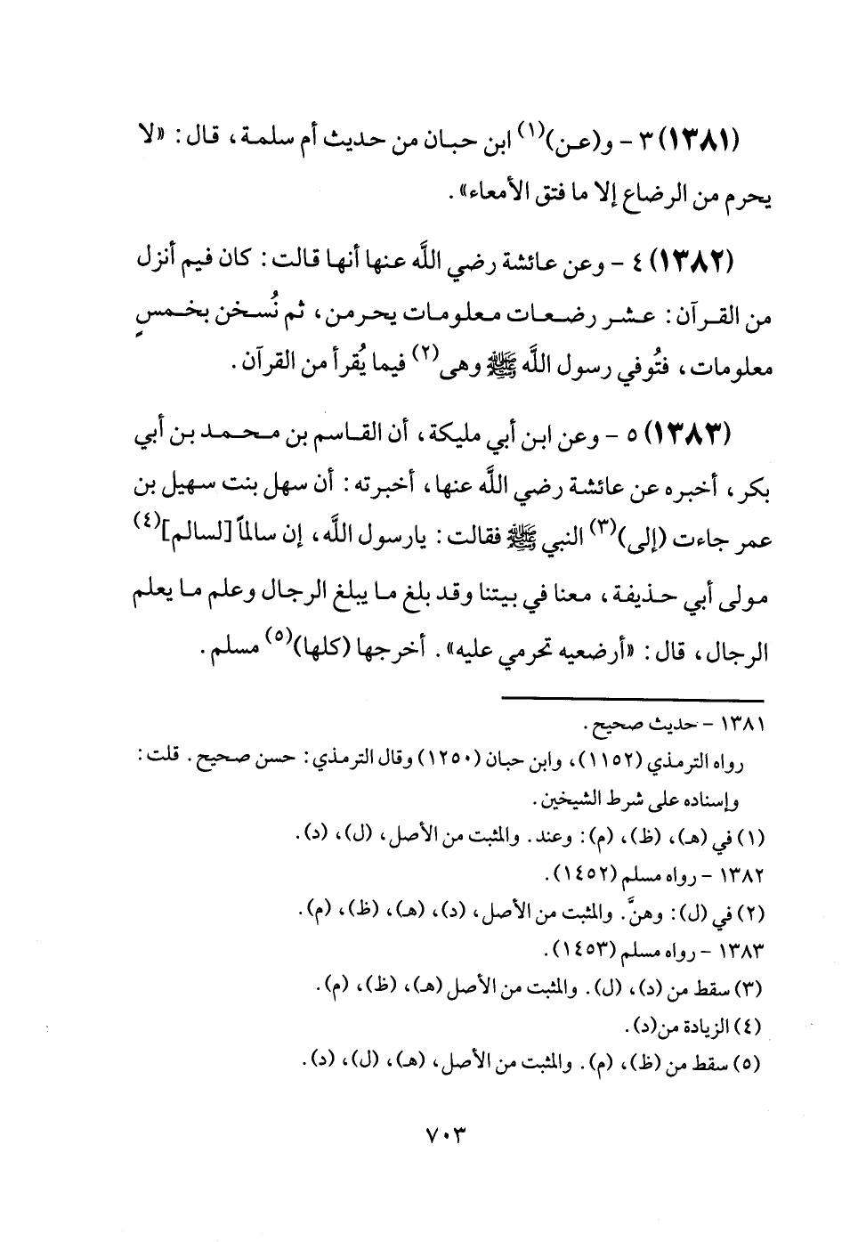 (1382) وَعَن عَائِشَة رَضِيَ اللَّهُ عَنْها أَنَّهَا قَالَت: كَانَ فيمَ أنزل من الْقُرْآن: عشر رَضعَات مَعْلُومَات يحرمن، ثمَّ نُسخن بخمسٍ مَعْلُومَات، فتُوفي رَسُول الله [صَلَّى اللَّهُ عَلَيْهِ وَسَلَّم َ] وَهِي فِيمَا يُقرأ من الْقُرْآن.