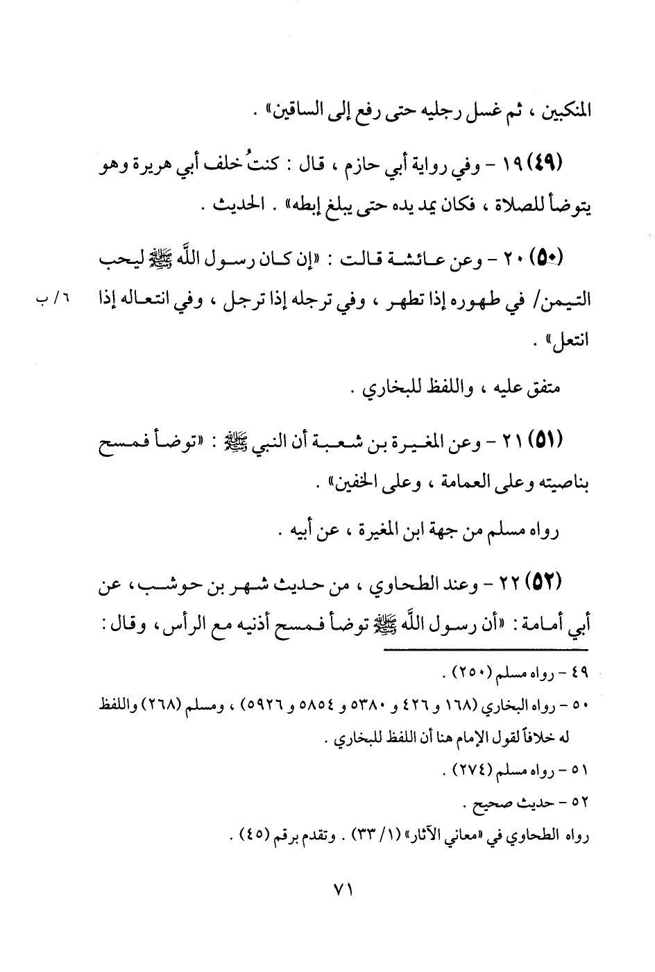 (51) وَعَن الْمُغيرَة بن شُعْبَة أَن النَّبِي [صَلَّى اللَّهُ عَلَيْهِ وَسَلَّم َ] : " تَوَضَّأ فَمسح بناصيته وَعَلَى الْعِمَامَة، وَعَلَى الْخُفَّيْنِ ". رَوَاهُ مُسلم من جِهَة ابْن الْمُغيرَة، عَن أَبِيه.