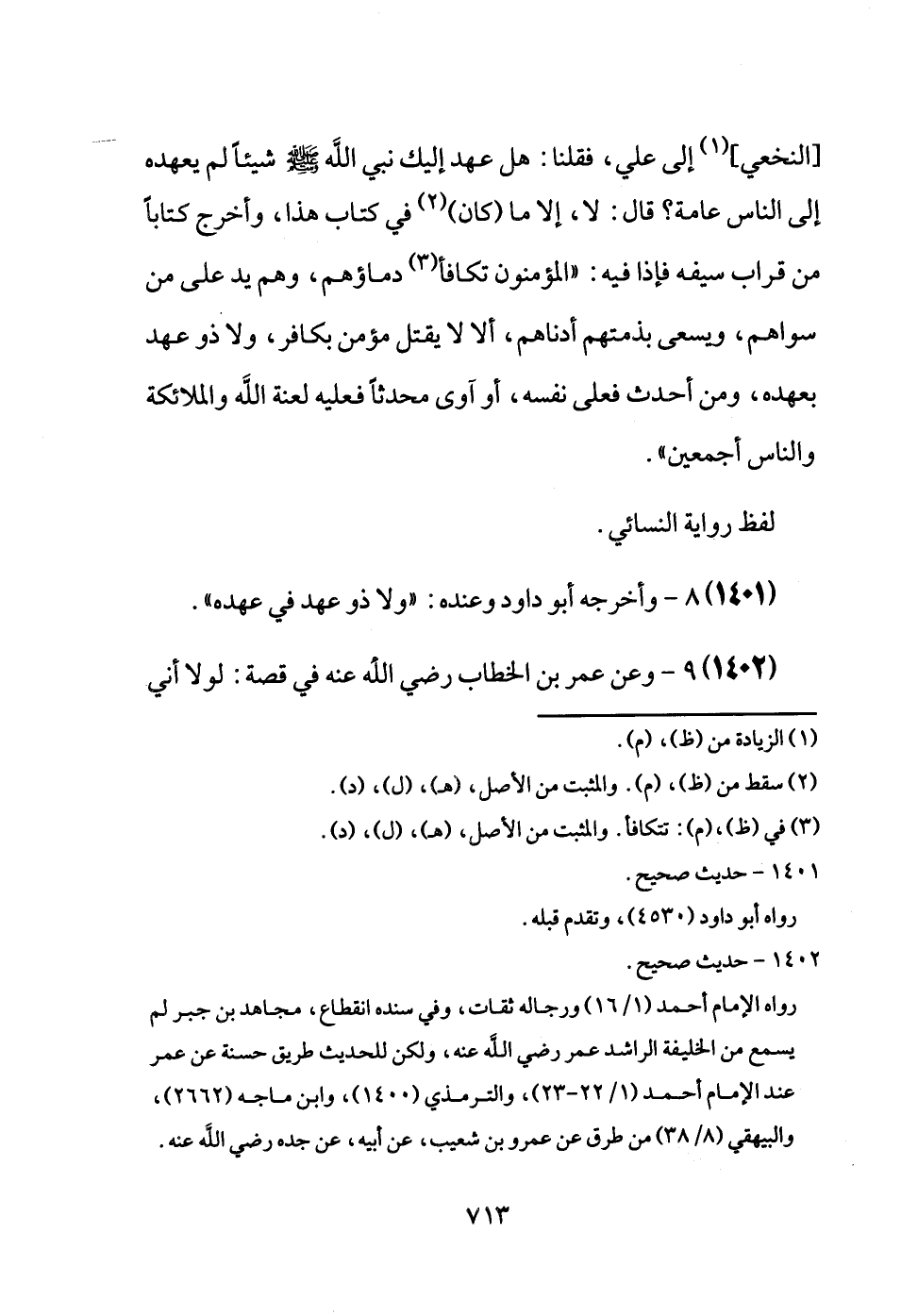 [النَّخعِيّ] إِلَى عَلّي، فَقُلْنَا: هَل عهد إِلَيْك نَبِي الله [صَلَّى اللَّهُ عَلَيْهِ وَسَلَّم َ] شَيْئا لم يعهده إِلَى النَّاس عَامَّة؟ قَالَ: لَا، إِلَّا مَا (كَانَ) فِي كتاب هَذَا، وَأخرج كتابا من قرَاب سَيْفه فَإِذا فِيهِ: " الْمُؤْمِنُونَ تكافأ دِمَاؤُهُمْ، وهم يَد عَلَى من سواهُم، وَيسْعَى بِذِمَّتِهِمْ أَدْنَاهُم، أَلا لَا يقتل مُؤمن بِكَافِر، وَلَا ذُو عهد بعهده، وَمن أحدث فعلَى نَفسه، أَو آوَى مُحدثا فَعَلَيهِ لعنة الله وَالْمَلَائِكَة وَالنَّاس أَجْمَعِينَ ". لفظ رِوَايَة النَّسَائِيّ.