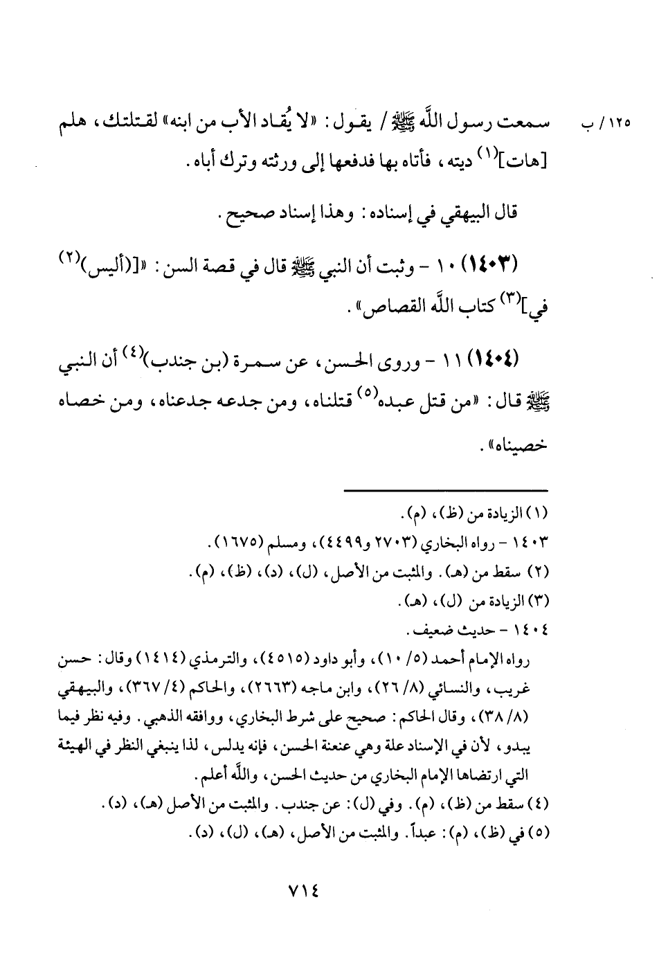 (1404) وَرَوَى الْحسن، عَن سَمُرَة (بن جُنْدُب) أَن النَّبِي [صَلَّى اللَّهُ عَلَيْهِ وَسَلَّم َ] قَالَ: " من قتل عَبده قَتَلْنَاهُ، وَمن جدعه جدعناه، وَمن خصاه خصيناه ".