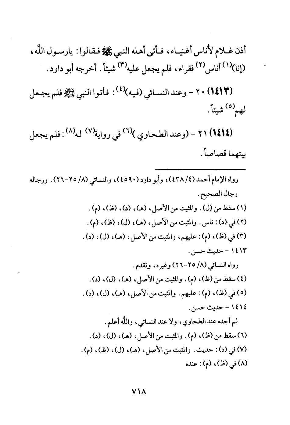 (1413) وَعند النَّسَائِيّ (فِيهِ) : فَأتوا النَّبِي [صَلَّى اللَّهُ عَلَيْهِ وَسَلَّم َ] فَلم يَجْعَل لَهُم شَيْئا.