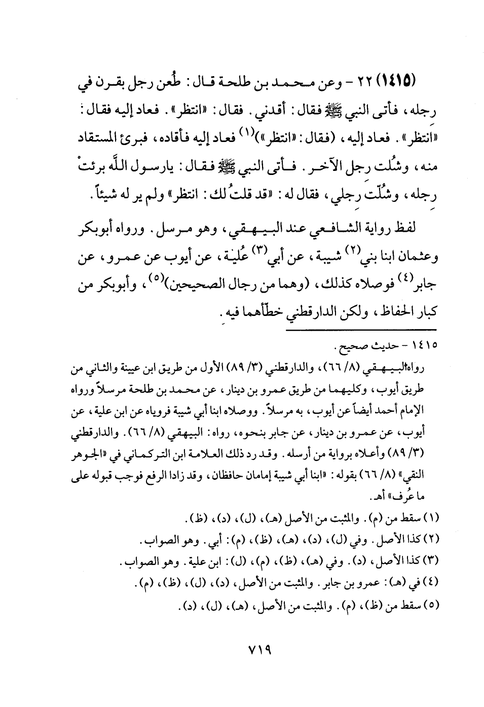 (1415) وَعَن مُحَمَّد بن طَلْحَة قَالَ: طُعن رجل بقرن فِي رِجله، فَأَتَى النَّبِي [صَلَّى اللَّهُ عَلَيْهِ وَسَلَّم َ] فَقَالَ: أقدني. فَقَالَ: " انْتظر ". فَعَاد إِلَيْهِ فَقَالَ: " انْتظر ". فَعَاد إِلَيْهِ، (فَقَالَ: " انْتظر ") فَعَاد إِلَيْهِ فأقاده، فبرئ المستقاد مِنْهُ، وشُلت رِجل الآخر. فَأَتَى النَّبِي [صَلَّى اللَّهُ عَلَيْهِ وَسَلَّم َ] فَقَالَ: يَا رَسُول الله برئتْ رِجله، وشُلّت رِجلي، فَقَالَ لَهُ: " قد قلتُ لَك: انْتظر " وَلم ير لَهُ شَيْئا. لفظ رِوَايَة الشَّافِعِي عِنْد الْبَيْهَقِيّ، وَهُوَ مُرْسل. وَرَوَاهُ أَبُو بكر وَعُثْمَان ابْنا بني شيبَة، عَن أبي عُلية، عَن أَيُّوب عَن عَمْرو، عَن جَابر فوصلاه كَذَلِك، (وهما من رجال الصَّحِيحَيْنِ) ، وَأَبُو بكر من كبار الْحفاظ، وَلَكِن الدَّارَقُطْنِيّ خطّأهما فِيهِ.