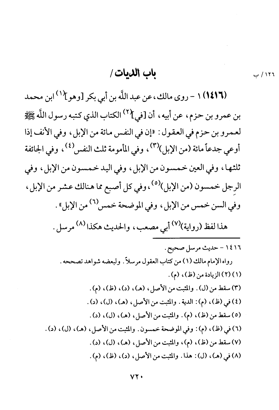 (1416) رَوَى مَالك، عَن عبد الله بن أبي بكر [وَهُوَ] ابْن مُحَمَّد بن عَمْرو بن حزم، عَن أَبِيه، أَن [فِي] الْكتاب الَّذِي كتبه رَسُول الله [صَلَّى اللَّهُ عَلَيْهِ وَسَلَّم َ] لعَمْرو بن حزم فِي الْعُقُول: " إِن فِي النَّفس مائَة من الْإِبِل، وَفِي الْأنف إِذا أوعي جدعاً مائَة (من الْإِبِل) ، وَفِي المأمومة ثلث النَّفس، وَفِي الْجَائِفَة ثلثهَا، وَفِي الْعين خَمْسُونَ من الْإِبِل، وَفِي الْيَد خَمْسُونَ من الْإِبِل، وَفِي الرِجل خَمْسُونَ (من الْإِبِل) ، وَفِي كل أصْبع مِمَّا هُنَالك عشر من الْإِبِل، وَفِي السن خمس من الْإِبِل، وَفِي الْمُوَضّحَة خمس من الْإِبِل ". هَذَا لفظ (رِوَايَة) أبي مُصعب، والْحَدِيث هَكَذَا مُرْسل.