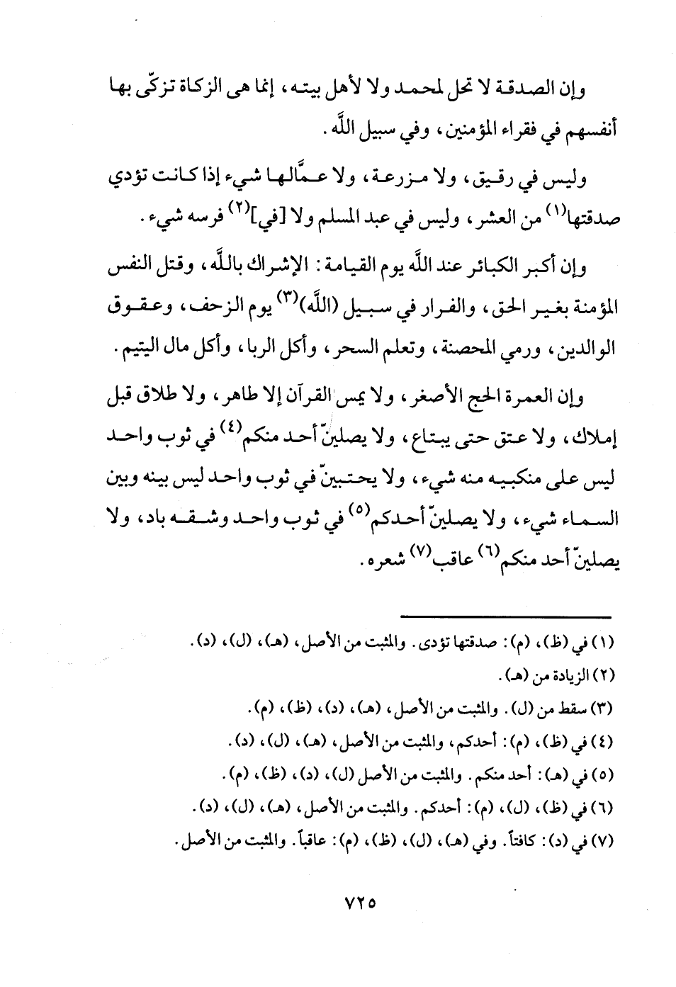 وَإِن الصَّدَقَة لَا تحل لمُحَمد وَلَا لأهل بَيته، إِنَّمَا هِيَ الزَّكَاة تزكّى بهَا أنفسهم فِي فُقَرَاء الْمُؤمنِينَ، وَفِي سَبِيل الله. وَلَيْسَ فِي رَقِيق، وَلَا مزرعة، وَلَا عمَّالها شَيْء إِذا كَانَت تُؤدِّي صدقتها من الْعشْر، وَلَيْسَ فِي عبد الْمُسلم وَلَا [فِي] فرسه شَيْء. وَإِن أكبر الْكَبَائِر عِنْد الله يَوْم الْقِيَامَة: الْإِشْرَاك بِاللَّه، وَقتل النَّفس المؤمنة بِغَيْر الْحق، والفرار فِي سَبِيل (الله) يَوْم الزَّحْف، وعقوق الْوَالِدين، وَرمي المحصنة، وَتعلم السحر، وَأكل الرِّبَا، وَأكل مَال الْيَتِيم. وَإِن الْعمرَة الْحَج الْأَصْغَر، وَلَا يمس الْقُرْآن إِلَّا طَاهِر، وَلَا طَلَاق قبل إملاك، وَلَا عتق حَتَّى يبْتَاع، وَلَا يصلينّ أحد مِنْكُم فِي ثوب وَاحِد لَيْسَ عَلَى مَنْكِبَيْه مِنْهُ شَيْء، وَلَا يحتبينّ فِي ثوب وَاحِد لَيْسَ بَينه وَبَين السَّمَاء شَيْء، وَلَا يصلينّ أحدكُم فِي ثوب وَاحِد وَشقه باد، وَلَا يصلينّ أحد مِنْكُم عاقب شعره.