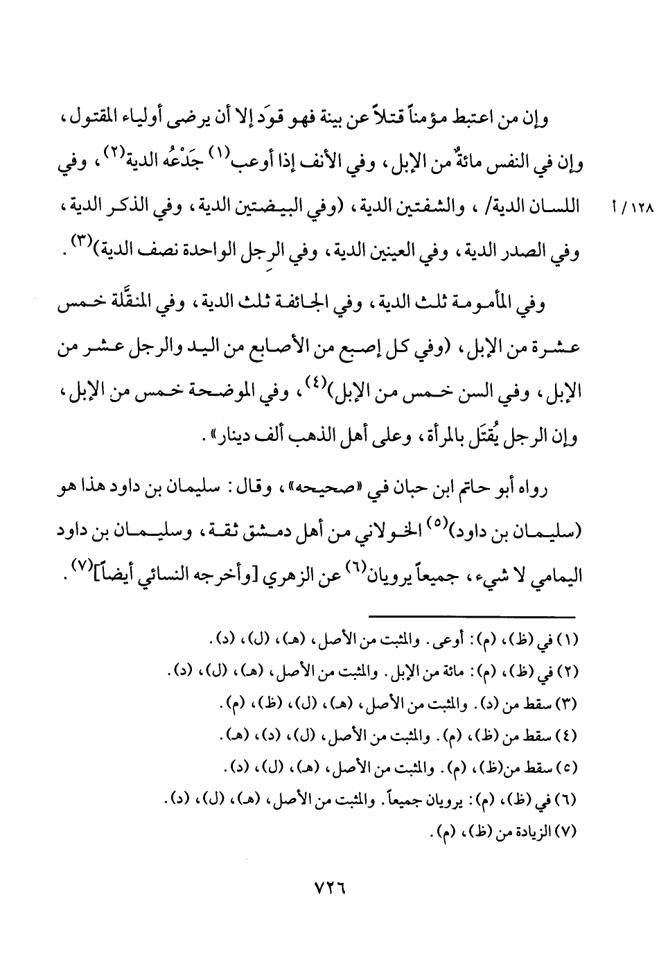 وَإِن من اعتبط مُؤمنا قتلا عَن بَيِّنَة فَهُوَ قوَد إِلَّا أَن يرْضَى أَوْلِيَاء الْمَقْتُول، وَإِن فِي النَّفس مائةٌ من الْإِبِل، وَفِي الْأنف إِذا أوعب جَدْعُه الدِّيَة، وَفِي اللِّسَان الدِّيَة /، والشفتين الدِّيَة / (وَفِي البيضتين الدِّيَة، وَفِي الذّكر الدِّيَة، وَفِي الصَّدْر الدِّيَة، وَفِي الْعَينَيْنِ الدِّيَة، وَفِي الرِجل الْوَاحِدَة نصف الدِّيَة) . وَفِي المأمومة ثلث الدِّيَة، وَفِي الْجَائِفَة ثلث الدِّيَة، وَفِي المنقَّلة خمس عشرَة من الْإِبِل، (وَفِي كل إِصْبَع من الْأَصَابِع من الْيَد وَالرجل عشر من الْإِبِل، وَفِي السن خمس من الْإِبِل) ، وَفِي الْمُوَضّحَة خمس من الْإِبِل، وَإِن الرجل يُقتَل بِالْمَرْأَةِ، وَعَلَى أهل الذَّهَب ألف دِينَار ". رَوَاهُ أَبُو حَاتِم بن حبَان فِي " صَحِيحه "، وَقَالَ: سُلَيْمَان بن دَاوُد هَذَا هُوَ (سُلَيْمَان بن دَاوُد) الْخَولَانِيّ من أهل دمشق ثِقَة، وَسليمَان بن دَاوُد اليمامي لَا شَيْء، جَمِيعًا يرويان عَن الزُّهْرِيّ [وَأخرجه النَّسَائِيّ أَيْضا] .
