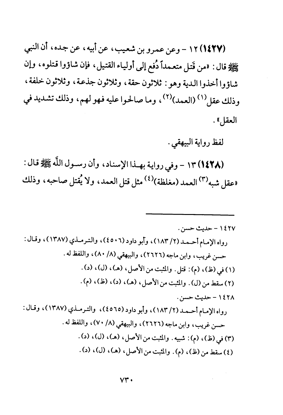 (1427) وَعَن عَمْرو بن شُعَيْب، عَن أَبِيه، عَن جده، أَن النَّبِي [صَلَّى اللَّهُ عَلَيْهِ وَسَلَّم َ] قَالَ: " من قَتل مُتَعَمدا دُفع إِلَى أَوْلِيَاء الْقَتِيل، فَإِن شاؤوا قَتَلُوهُ، وَإِن شاؤوا أخذُوا الدِّيَة وَهُوَ: ثَلَاثُونَ حقة، وَثَلَاثُونَ جَذَعَة، وَثَلَاثُونَ خلفة، وَذَلِكَ عقل (الْعمد) ، وَمَا صَالحُوا عَلَيْهِ فَهُوَ لَهُم، وَذَلِكَ تَشْدِيد فِي الْعقل ". لفظ رِوَايَة الْبَيْهَقِيّ.