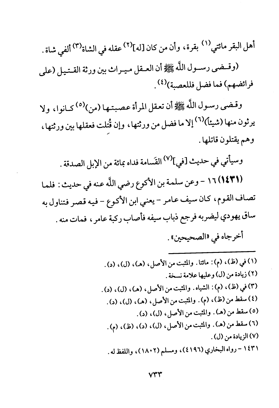أهل الْبَقر مِائَتي بقرة، وَأَن من كَانَ [لَهُ] عقله فِي الشَّاة ألفي شَاة. (وَقَضَى رَسُول الله [صَلَّى اللَّهُ عَلَيْهِ وَسَلَّم َ] أَن الْعقل مِيرَاث بَين وَرَثَة الْقَتِيل (عَلَى فرائضهم) فَمَا فضل فللعصبة) . وَقَضَى رَسُول الله [صَلَّى اللَّهُ عَلَيْهِ وَسَلَّم َ] أَن تعقل الْمَرْأَة عصبتها (من) كَانُوا، وَلَا يَرِثُونَ مِنْهَا (شَيْئا) إِلَّا مَا فضل من ورثتها، وَإِن قُتِلت فعقلها بَين ورثتها، وهم يقتلُون قاتلها. وَسَيَأْتِي فِي حَدِيث [فِي] القَسامة فدَاه بِمِائَة من الْإِبِل الصَّدَقَة.