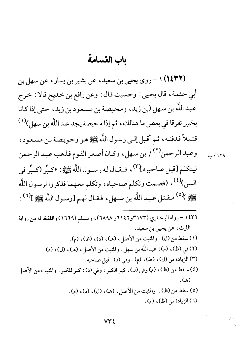 (1432) رَوَى يَحْيَى بن سعيد، عَن بشير بن يسَار، عَن سهل بن أبي حثْمَة، قَالَ يَحْيَى: وحسبت قَالَ: وَعَن رَافع بن خديج قَالَا: خرج عبد الله بن سهل (بن زيد، ومحيصة بن مَسْعُود بن زيد، حَتَّى إِذا كَانَا بِخَيْبَر تفَرقا فِي بعض مَا هُنَالك، ثمَّ إِذا محيصة يجد عبد الله بن سهل) قَتِيلا فدفنه، ثمَّ أقبل إِلَى رَسُول الله [صَلَّى اللَّهُ عَلَيْهِ وَسَلَّم َ] هُوَ وحويصة بن مَسْعُود، وَعبد الرَّحْمَن / بن سهل، وَكَانَ أَصْغَر الْقَوْم فَذهب عبد الرَّحْمَن ليَتَكَلَّم [قبل صَاحِبيهِ] ، فَقَالَ لَهُ رَسُول الله [صَلَّى اللَّهُ عَلَيْهِ وَسَلَّم َ] : " كبِّر (كبِّر فِي السن) ، (فَصمت وَتكلم صَاحِبَاه، وَتكلم مَعَهُمَا فَذكرُوا لرَسُول الله [صَلَّى اللَّهُ عَلَيْهِ وَسَلَّم َ] ) مقتل عبد الله بن سهل، فَقَالَ لَهُم [رَسُول الله [صَلَّى اللَّهُ عَلَيْهِ وَسَلَّم َ]] :