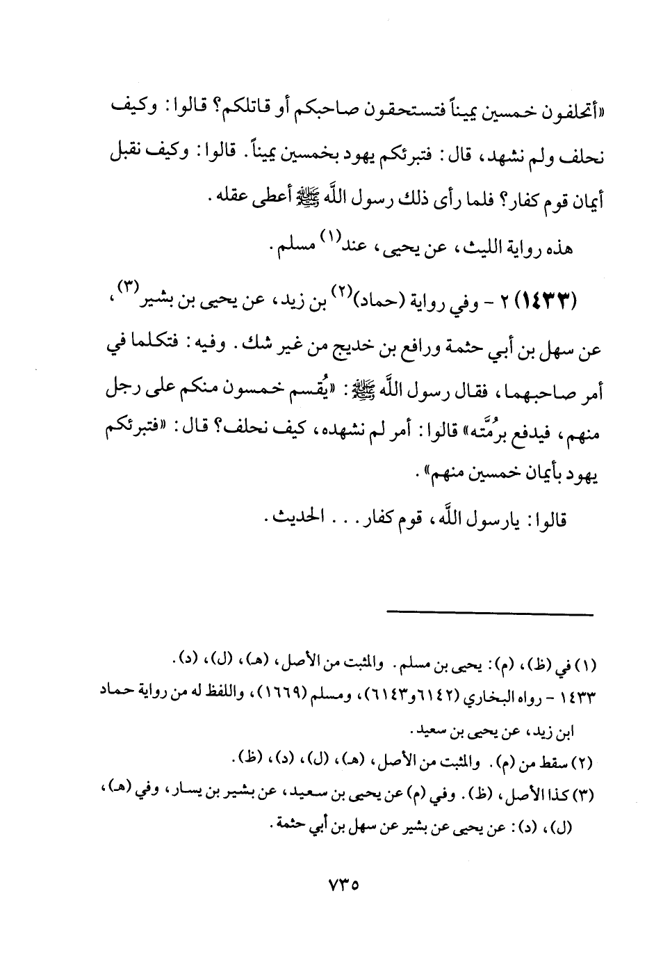 (1433) وَفِي رِوَايَة (حَمَّاد) بن زيد، عَن يَحْيَى بن بشير، عَن سهل بن أبي حثْمَة وَرَافِع بن خديج من غير شكّ. وَفِيه: فتكلما فِي أَمر صَاحبهمَا، فَقَالَ رَسُول الله [صَلَّى اللَّهُ عَلَيْهِ وَسَلَّم َ] : " يُقسم خَمْسُونَ مِنْكُم عَلَى رجل مِنْهُم، فَيدْفَع برُمَّته " قَالُوا: أَمر لم نشهده، كَيفَ نحلف؟ قَالَ: " فتبرئكم يهود بأيمان خمسين مِنْهُم ". قَالُوا: يَا رَسُول الله، قوم كفار ... الحَدِيث.