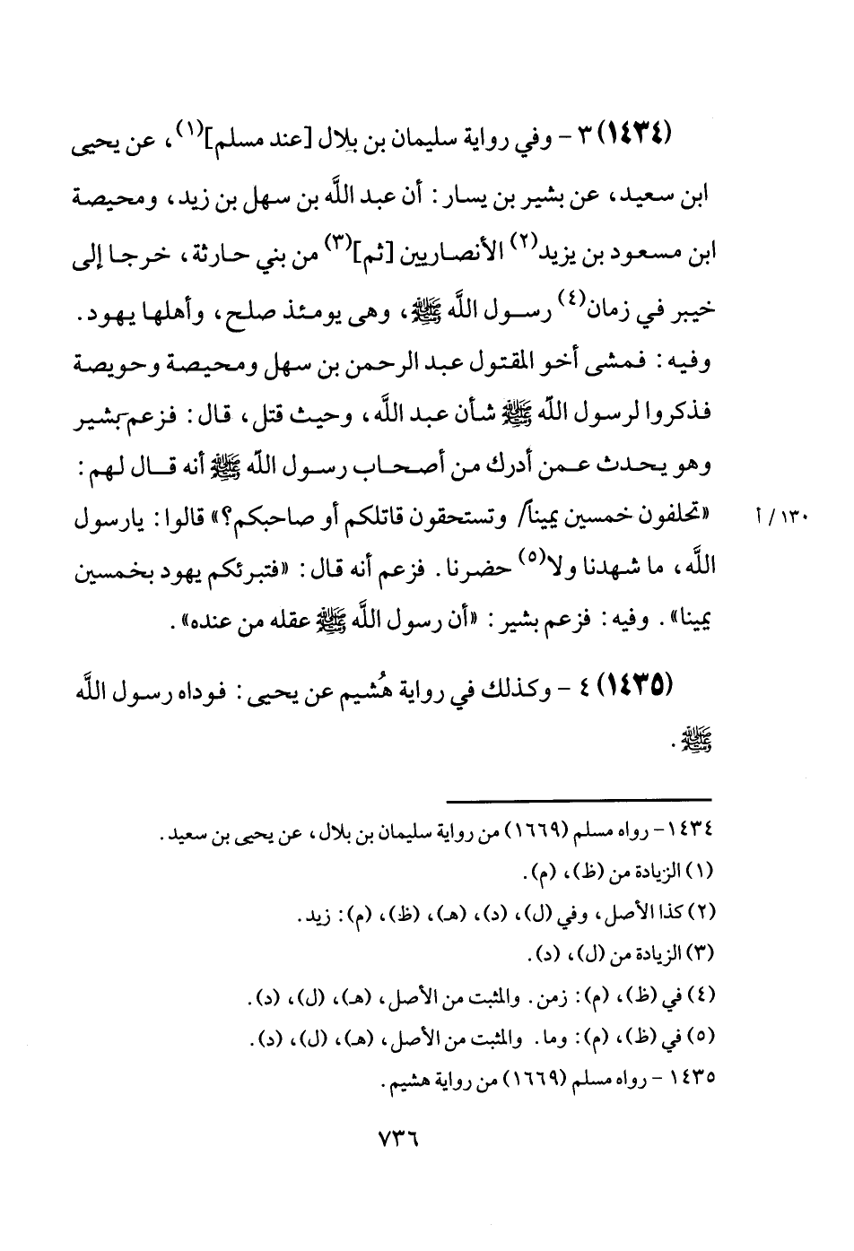 (1434) وَفِي رِوَايَة سُلَيْمَان بن بِلَال [عِنْد مُسلم] ، عَن يَحْيَى بن سعيد، عَن بشير بن يسَار: أَن عبد الله بن سهل بن زيد، ومحيصة بن مَسْعُود بن يزِيد الأنصاريين [ثمَّ] من بني حَارِثَة، خرجا إِلَى خَيْبَر فِي زمَان رَسُول الله [صَلَّى اللَّهُ عَلَيْهِ وَسَلَّم َ] ، وَهُوَ يَوْمئِذٍ صلح، وَأَهْلهَا يهود. وَفِيه: فَمَشى أَخُو الْمَقْتُول عبد الرَّحْمَن بن سهل ومحيصة وحويصة فَذكرُوا لرَسُول الله [صَلَّى اللَّهُ عَلَيْهِ وَسَلَّم َ] شَأْن عبد الله، وَحَيْثُ قتل، قَالَ: فَزعم بشير وَهُوَ يحدث عَمَّن أدْرك من أَصْحَاب رَسُول الله [صَلَّى اللَّهُ عَلَيْهِ وَسَلَّم َ] أَنه قَالَ لَهُم: " تحلفون خمسين يَمِينا / وتستحقون قاتلكم أَو صَاحبكُم؟ " قَالُوا: يَا رَسُول الله، مَا شَهِدنَا وَلَا حَضَرنَا. فَزعم أَنه قَالَ: " فتبرئكم يهود بِخَمْسِينَ يَمِينا ". وَفِيه: فَزعم بشير: " أَن رَسُول الله [صَلَّى اللَّهُ عَلَيْهِ وَسَلَّم َ] عقله من عِنْده ".