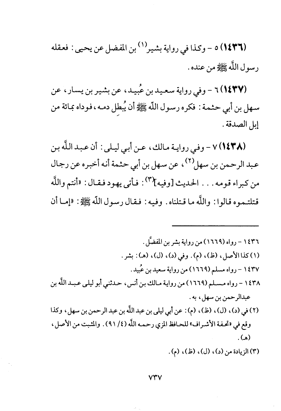 (1437) وَفِي رِوَايَة سعيد بن عُبيد، عَن بشير بن يسَار، عَن سهل بن أبي حثْمَة: فكره رَسُول الله [صَلَّى اللَّهُ عَلَيْهِ وَسَلَّم َ] أَن يُبطِل دَمه، فوداه بِمِائَة من إبل الصَّدَقَة.