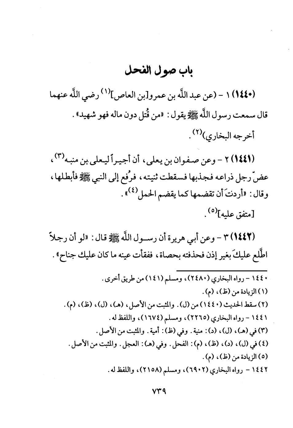 (1440) (عَن عبد الله بن عَمْرو [بن الْعَاصِ] رَضِيَ اللَّهُ عَنْهما قَالَ سَمِعت رَسُول الله [صَلَّى اللَّهُ عَلَيْهِ وَسَلَّم َ] يَقُول: " من قُتل دون مَاله فَهُوَ شَهِيد ". أخرجه البُخَارِيّ) .