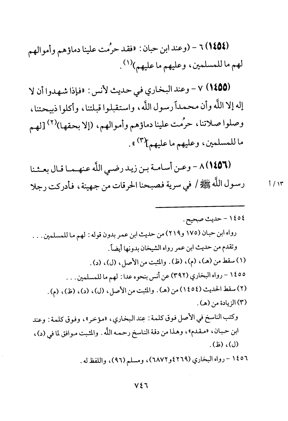 (1454) (وَعند ابْن حبَان: " فقد حُرمت علينا دِمَاؤُهُمْ وَأَمْوَالهمْ لَهُم مَا للْمُسلمين، وَعَلَيْهِم مَا عَلَيْهِم) .