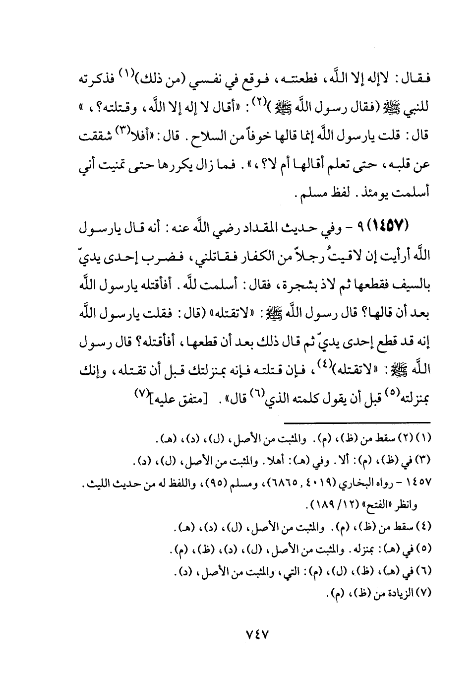 (1457) وَفِي حَدِيث الْمِقْدَاد رَضِيَ اللَّهُ عَنْه: أَنه قَالَ يَا رَسُول الله أَرَأَيْت إِن لاقيتُ رجلا من الْكفَّار فقاتلني، فَضرب إِحْدَى يديّ بِالسَّيْفِ فقطعها ثمَّ لَاذَ بشجرة، فَقَالَ: أسلمت لله. أفأقتله يَا رَسُول الله بعد أَن قَالَهَا؟ قَالَ رَسُول الله [صَلَّى اللَّهُ عَلَيْهِ وَسَلَّم َ] : " لَا تقتله " (قَالَ: فَقلت يَا رَسُول الله إِنَّه قد قطع إِحْدَى يديّ ثمَّ قَالَ ذَلِك بعد أَن قطعهَا، أفأقتله؟ قَالَ رَسُول الله [صَلَّى اللَّهُ عَلَيْهِ وَسَلَّم َ] " لَا تقتله) ، فَإِن قتلته فَإِنَّهُ بمنزلتك قبل أَن تقتله، وَإنَّك بِمَنْزِلَتِهِ قبل أَن يَقُول كَلمته الَّتِي قَالَ ". [مُتَّفق عَلَيْهِ] .