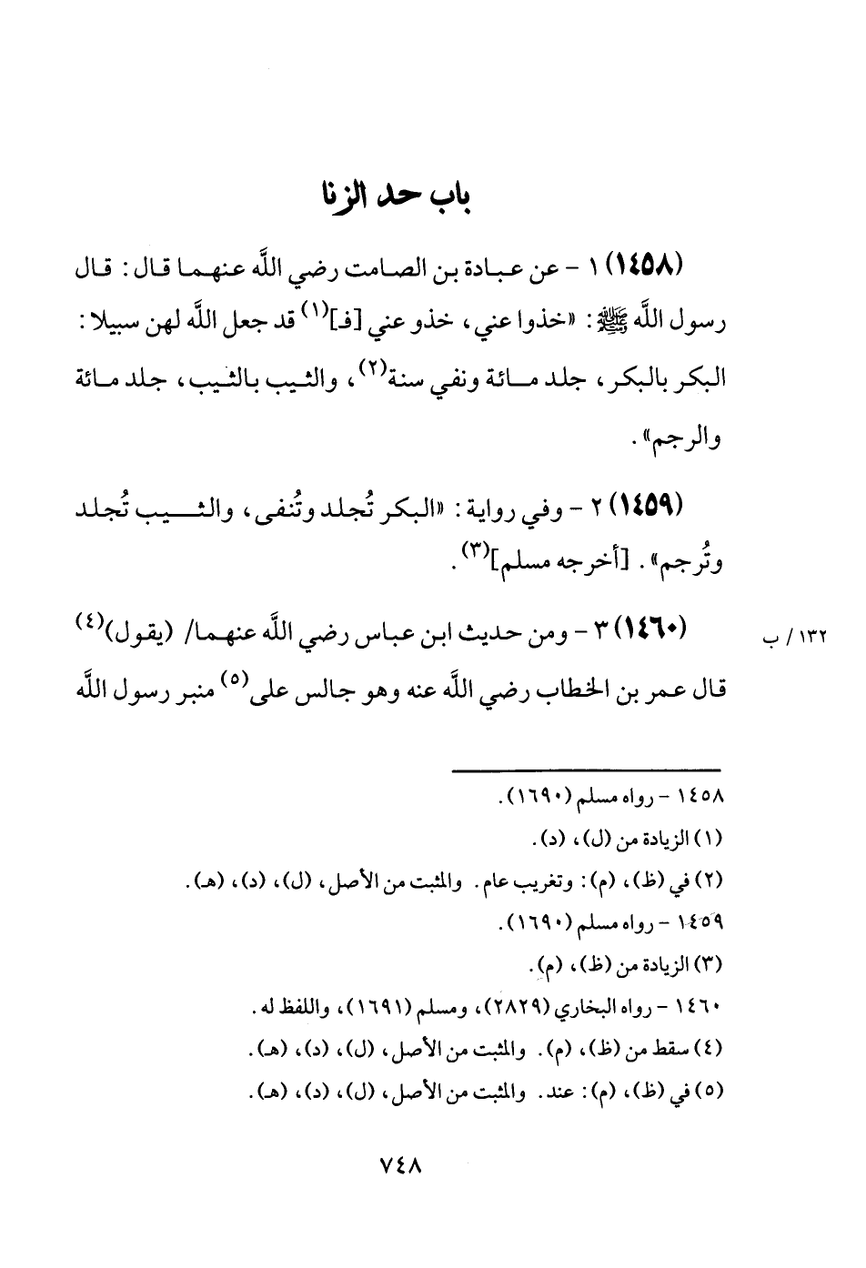 (1458) عَن عبَادَة بن الصَّامِت رَضِيَ اللَّهُ عَنْه قَالَ: قَالَ رَسُول الله [صَلَّى اللَّهُ عَلَيْهِ وَسَلَّم َ] : " خُذُوا عني، خُذُوا عني [ف] قد جعل الله لَهُنَّ سَبِيلا: الْبكر بالبكر، جلد مائَة وَنفي سنة، وَالثَّيِّب بِالثَّيِّبِ، جلد مائَة وَالرَّجم ".