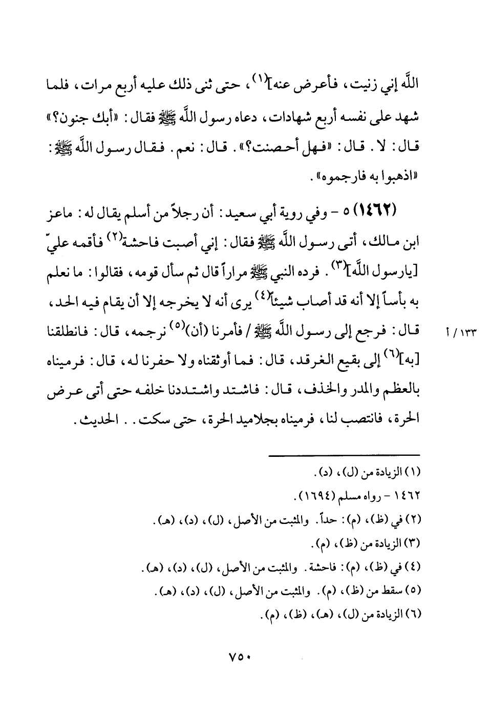 (1462) وَفِي رِوَايَة أبي سعيد: أَن رجلا من أسلم يُقَال لَهُ: مَاعِز بن مَالك، أَتَى رَسُول الله [صَلَّى اللَّهُ عَلَيْهِ وَسَلَّم َ] فَقَالَ: إِنِّي أصبت فَاحِشَة فأقمه عليّ [يَا رَسُول الله] . فَرده النَّبِي [صَلَّى اللَّهُ عَلَيْهِ وَسَلَّم َ] مرَارًا قَالَ ثمَّ سَأَلَ قومه، فَقَالُوا: مَا نعلم بِهِ بَأْسا إِلَّا أَنه قد أصَاب شَيْئا يرَى أَنه لَا يُخرجهُ إِلَّا أَن يُقَام فِيهِ الْحَد، قَالَ: فَرجع إِلَى رَسُول الله [صَلَّى اللَّهُ عَلَيْهِ وَسَلَّم َ] / فَأمرنَا (أَن) نرجمه، قَالَ: فَانْطَلَقْنَا [بِهِ] إِلَى بَقِيع الْغَرْقَد، قَالَ: فَمَا أوثقناه وَلَا حفرنا لَهُ، قَالَ: فرميناه بالعظم والمدر والخذف، قَالَ: فَاشْتَدَّ واشتددنا خَلفه حَتَّى أَتَى عرض الْحرَّة، فانتصب لنا، فرميناه بجلاميد الْحرَّة، حَتَّى سكت ... الحَدِيث.