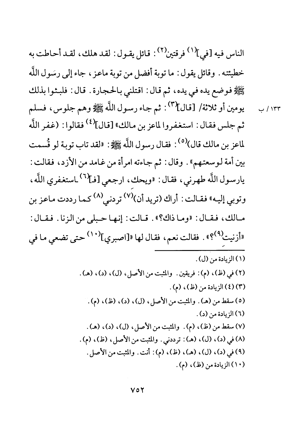النَّاس فِيهِ [فِي] فرْقَتَيْن. قَائِل يَقُول: لقد هلك، لقد أحاطت بِهِ خطيئته. وَقَائِل يَقُول: مَا تَوْبَة أفضل من تَوْبَة مَاعِز، جَاءَ إِلَى رَسُول الله [صَلَّى اللَّهُ عَلَيْهِ وَسَلَّم َ] فَوضع يَده فِي يَده، ثمَّ قَالَ: اقتلني بِالْحِجَارَةِ. قَالَ: فلبثوا بذلك يَوْمَيْنِ أَو ثَلَاثَة / [قَالَ] : ثمَّ جَاءَ رَسُول الله [صَلَّى اللَّهُ عَلَيْهِ وَسَلَّم َ] وهم جُلُوس، فَسلم ثمَّ جلس فَقَالَ: اسْتَغْفرُوا لماعز بن مَالك " [قَالَ] فَقَالُوا: (غفر الله لماعز بن مَالك قَالَ) : فَقَالَ رَسُول الله [صَلَّى اللَّهُ عَلَيْهِ وَسَلَّم َ] : " لقد تَابَ تَوْبَة لَو قُسمت بَين أمة لوسعتهم ". وَقَالَ: ثمَّ جَاءَتْهُ امْرَأَة من غامد من الأزد، فَقَالَت: يَا رَسُول الله طهرني، فَقَالَ: " ويحكِ، ارجعي [ف] استغفري الله، وتوبي إِلَيْهِ " فَقَالَت: أَرَاك (تُرِيدُ أَن) تردني كَمَا رددت مَاعِز بن مَالك، فَقَالَ: " وَمَا ذَاك؟ ". قَالَت: إِنَّهَا حُبْلَى من الزِّنَا. فَقَالَ: " أزنيت؟ ". فَقَالَت نعم، فَقَالَ لَهَا " [اصْبِرِي] حَتَّى تَضَعِي مَا فِي