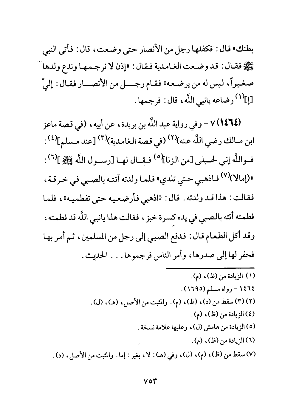 (1464) وَفِي رِوَايَة عبد الله بن بُرَيْدَة، عَن أَبِيه (فِي قصَّة مَاعِز ابْن مَالك رَضِيَ اللَّهُ عَنْه) (فِي قصَّة الغامدية) [عِنْد مُسلم] : فوَاللَّه إِنِّي لحبلى [من الزِّنَا] فَقَالَ لَهَا [رَسُول الله [صَلَّى اللَّهُ عَلَيْهِ وَسَلَّم َ]] : " (إمالا) فاذهبي حَتَّى تلدي " فَلَمَّا وَلدته أَتَتْهُ بِالصَّبِيِّ فِي خرقَة، فَقَالَت: هَذَا قد وَلدته. قَالَ: " اذهبي فأرضعيه حَتَّى تفطميه "، فَلَمَّا فَطَمته أَتَتْهُ بِالصَّبِيِّ فِي يَده كِسرة خبز، فَقَالَت هَذَا يَا نَبِي الله قد فَطَمته، وَقد أكل الطَّعَام قَالَ: فَدفع الصَّبِي إِلَى رجل من الْمُسلمين، ثمَّ أَمر بهَا فحفر لَهَا إِلَى صدرها، وَأمر النَّاس فرجموها ... الحَدِيث.