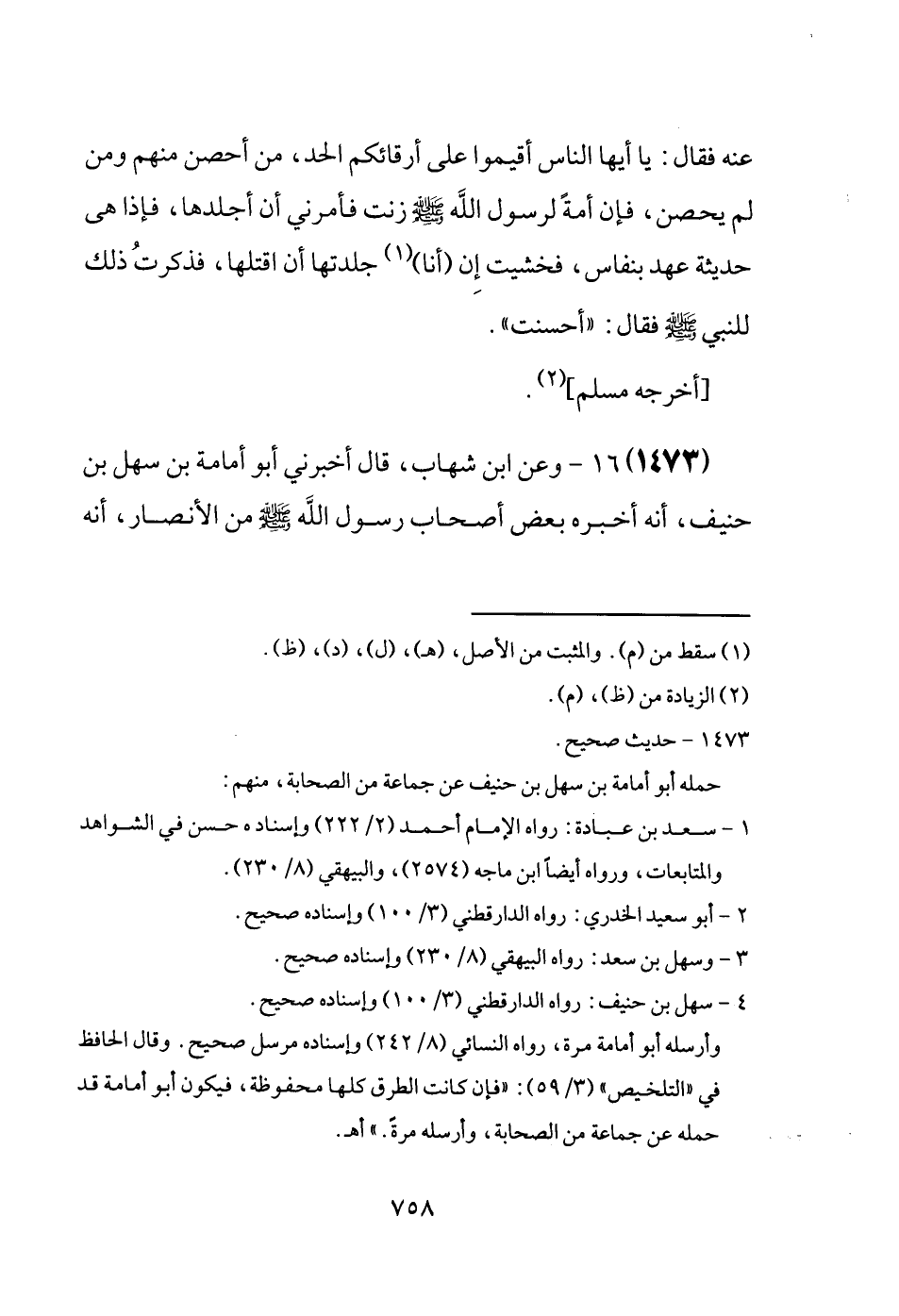عَنهُ فَقَالَ: يَا أَيهَا النَّاس أقِيمُوا عَلَى أرقائكم الْحَد، من أحصن مِنْهُم وَمن لم يحصن، فَإِن أمة لرَسُول الله [صَلَّى اللَّهُ عَلَيْهِ وَسَلَّم َ] زنت فَأمرنِي أَن أجلدها، فَإِذا هِيَ حَدِيثَة عهد بنفاس، فَخَشِيت إِن (أَنا) جلدتها أَن أقتلها، فذكرتُ ذَلِك للنَّبِي [صَلَّى اللَّهُ عَلَيْهِ وَسَلَّم َ] فَقَالَ: " أَحْسَنت ". [أخرجه مُسلم] .