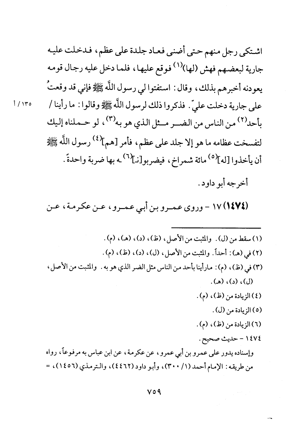 اشْتَكَى رجل مِنْهُم حَتَّى أضنى فَعَاد جلدَة عَلَى عظم، فَدخلت عَلَيْهِ جَارِيَة لبَعْضهِم فهش (لَهَا) فَوَقع عَلَيْهَا، فَلَمَّا دخل عَلَيْهِ رجال قومه يعودنه أخْبرهُم بذلك، وَقَالَ: استفتوا لي رَسُول الله [صَلَّى اللَّهُ عَلَيْهِ وَسَلَّم َ] فَإِنِّي قد وقعتُ عَلَى جَارِيَة دخلت عليّ. فَذكرُوا ذَلِك لرَسُول الله [صَلَّى اللَّهُ عَلَيْهِ وَسَلَّم َ] وَقَالُوا: مَا رَأينَا / بِأحد من النَّاس من الضّر مثل الَّذِي هُوَ بِهِ، لَو حملناه إِلَيْك لتفسخت عِظَامه مَا هُوَ إِلَّا جلد عَلَى عظم، فَأمر [هم] رَسُول الله [صَلَّى اللَّهُ عَلَيْهِ وَسَلَّم َ] أَن يَأْخُذُوا [لَهُ] مائَة شِمْرَاخ، فيضربو [ن] هـ بهَا ضَرْبَة وَاحِدَة. أخرجه أَبُو دَاوُد.