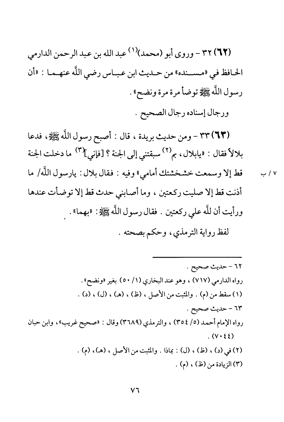 (62) وَرَوَى أَبُو (مُحَمَّد) عبد الله بن عبد الرَّحْمَن الدَّارمِيّ الْحَافِظ فِي " مُسْنده " من حَدِيث ابْن عَبَّاس رَضِيَ اللَّهُ عَنْهما: " أَن رَسُول الله [صَلَّى اللَّهُ عَلَيْهِ وَسَلَّم َ] تَوَضَّأ مرّة مرّة ونضح ". وَرِجَال إِسْنَاده رجال الصَّحِيح.