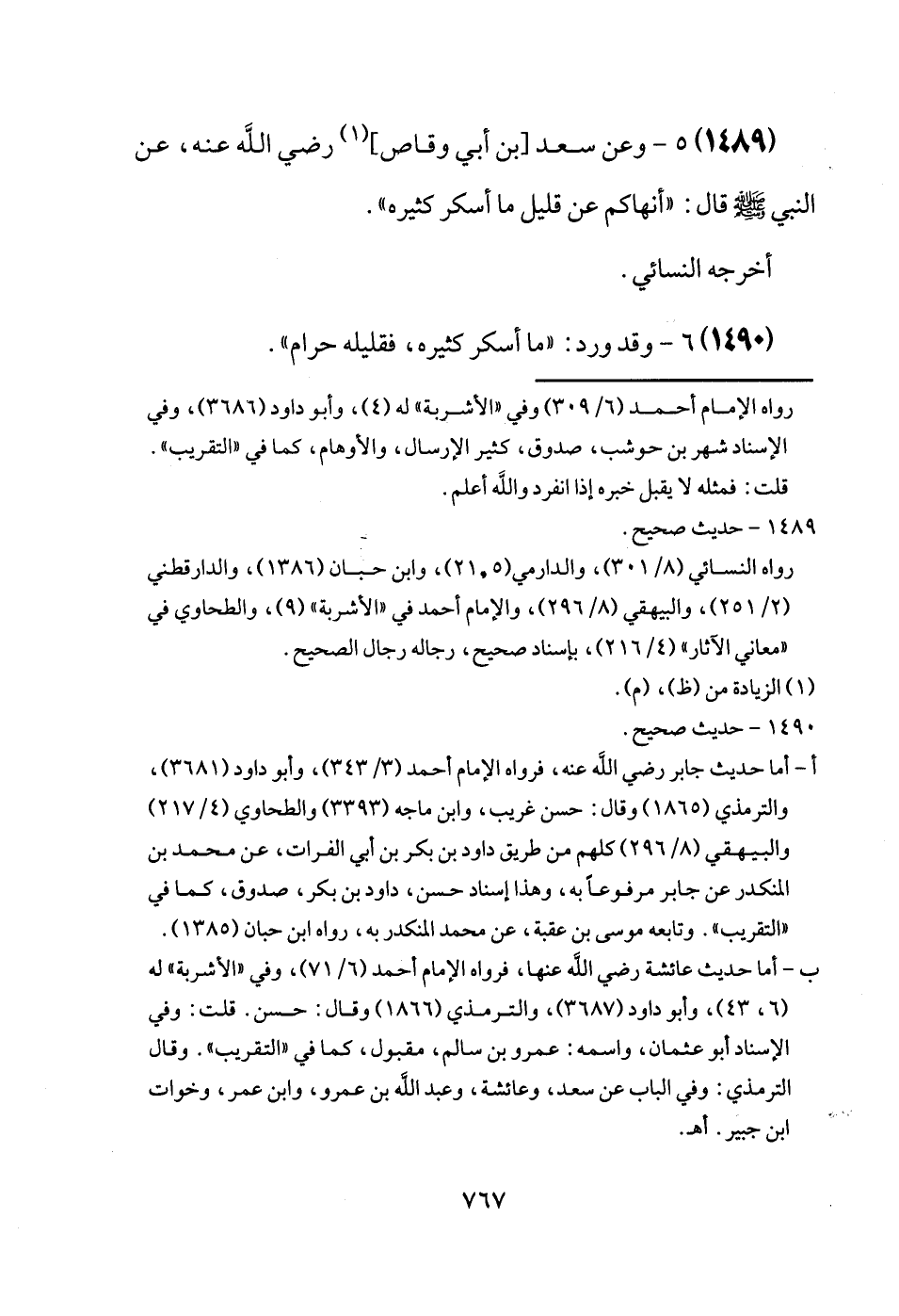 (1489) وَعَن سعد [بن أبي وَقاص] رَضِيَ اللَّهُ عَنْه، عَن النَّبِي [صَلَّى اللَّهُ عَلَيْهِ وَسَلَّم َ] قَالَ: " أنهاكم عَن قَلِيل مَا أسكر كَثِيره ". أخرجه النَّسَائِيّ.