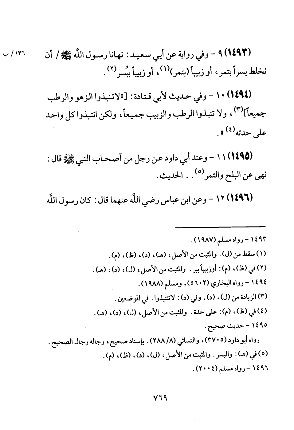 (1493) وَفِي رِوَايَة عَن أبي سعيد: نَهَانَا رَسُول الله [صَلَّى اللَّهُ عَلَيْهِ وَسَلَّم َ] / أَن نخلط بسراً بِتَمْر، أَو زبيباً (بِتَمْر) ، أَو زبيباً ببُسر.