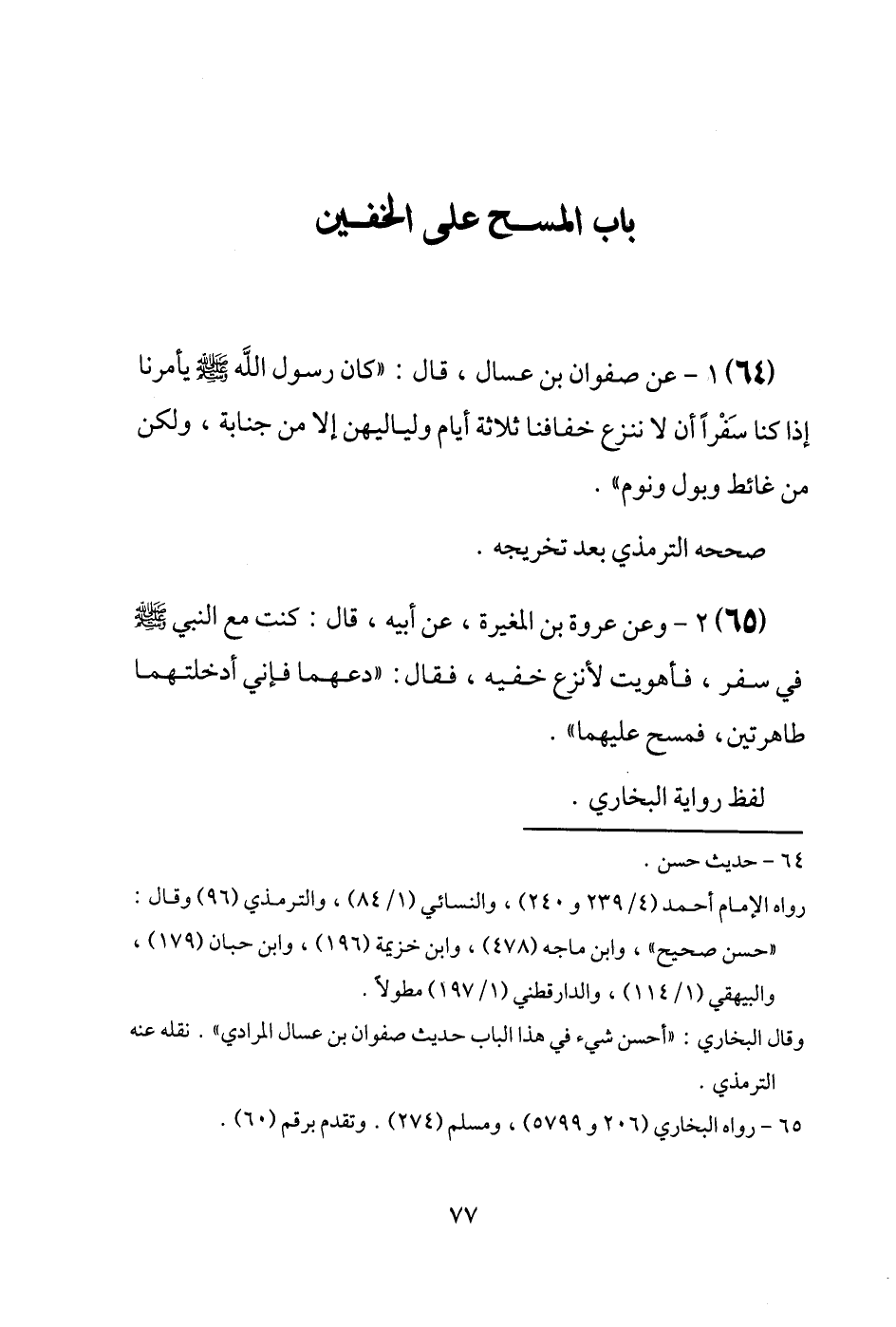 (64) عَن صَفْوَان بن عَسَّال، قَالَ: " كَانَ رَسُول الله [صَلَّى اللَّهُ عَلَيْهِ وَسَلَّم َ] يَأْمُرنَا إِذا كُنَّا سَفْراً أَن لَا ننزع خفافنا ثَلَاثَة أَيَّام ولياليهن إِلَّا من جَنَابَة، وَلَكِن من غَائِط وَبَوْل ونوم ". صَححهُ التِّرْمِذِيّ بعد تَخْرِيجه.