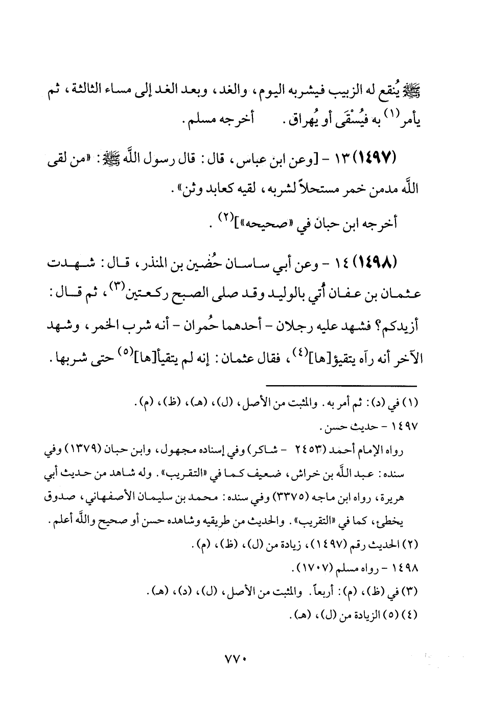 (1497) [وَعَن ابْن عَبَّاس، قَالَ: قَالَ رَسُول الله [صَلَّى اللَّهُ عَلَيْهِ وَسَلَّم َ] : " من لقى الله مدمن خمر مستحلاً لشربه، لقِيه كعابد وثن ". أخرجه ابْن حبَان فِي " صَحِيحه "] .
