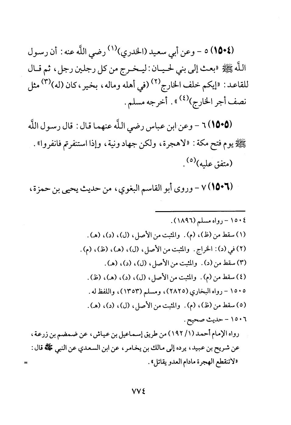 (1504) وَعَن أبي سعيد (الْخُدْرِيّ) رَضِيَ اللَّهُ عَنْه: أَن رَسُول الله [صَلَّى اللَّهُ عَلَيْهِ وَسَلَّم َ] " بعث إِلَى بني لحيان: ليخرج من كل رجلَيْنِ رجل، ثمَّ قَالَ للقاعد: " إيكم خلف الْخَارِج (فِي أَهله وَمَاله، بِخَير، كَانَ (لَهُ) مثل نصف أجر الْخَارِج) ". أخرجه مُسلم.