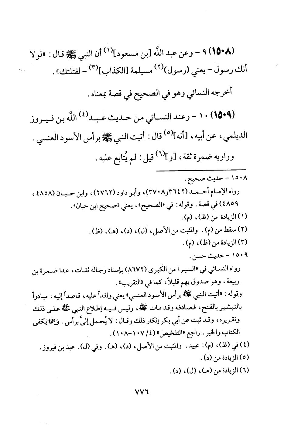 (1509) وَعند النَّسَائِيّ من حَدِيث عبد الله بن فَيْرُوز الديلمي، عَن أَبِيه، [أَنه] قَالَ: أتيت النَّبِي [صَلَّى اللَّهُ عَلَيْهِ وَسَلَّم َ] بِرَأْس الْأسود الْعَنسِي. وَرَاوِيه ضَمرَة ثِقَة، [و] قيل: لم يُتابع عَلَيْهِ.
