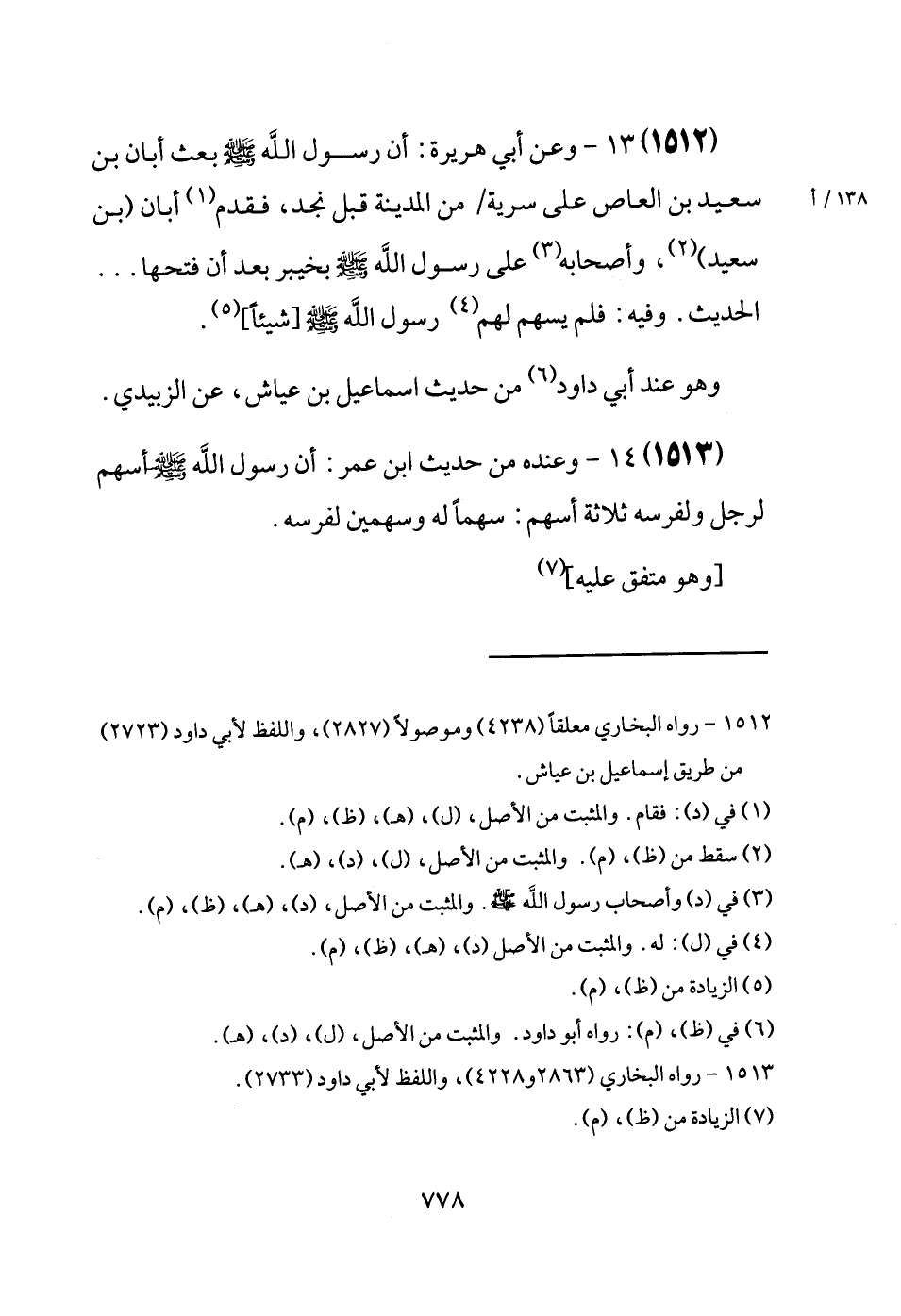 (1512) وَعَن أبي هُرَيْرَة: أَن رَسُول الله [صَلَّى اللَّهُ عَلَيْهِ وَسَلَّم َ] بعث أبان بن سعيد بن الْعَاصِ عَلَى سَرِيَّة / من الْمَدِينَة قبل نجد، فَقدم أبان (بن سعيد) ، وَأَصْحَابه عَلَى رَسُول الله [صَلَّى اللَّهُ عَلَيْهِ وَسَلَّم َ] بِخَيْبَر بعد أَن فتحهَا ... الحَدِيث. وَفِيه: فَلم يُسهم لَهُم رَسُول الله [صَلَّى اللَّهُ عَلَيْهِ وَسَلَّم َ] [شَيْئا] . وَهُوَ عِنْد أبي دَاوُد من حَدِيث إِسْمَاعِيل بن عَيَّاش، عَن الزبيدِيّ.