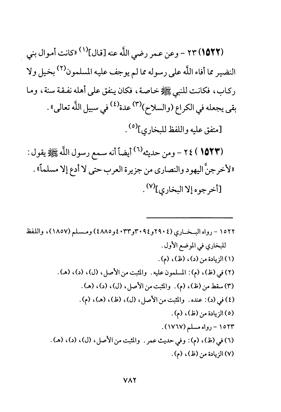 (1522) وَعَن عمر رَضِيَ اللَّهُ عَنْه [قَالَ] " كَانَت أَمْوَال بني النَّضِير مِمَّا أَفَاء الله عَلَى رَسُوله مِمَّا لم يوجف عَلَيْهِ الْمُسلمُونَ بخيل وَلَا ركاب، فَكَانَت للنَّبِي [صَلَّى اللَّهُ عَلَيْهِ وَسَلَّم َ] خَاصَّة، فَكَانَ ينْفق عَلَى أَهله نَفَقَة سنة، وَمَا بَقِي يَجعله فِي الكراع (وَالسِّلَاح) عدَّة فِي سَبِيل الله تَعَالَى ". [مُتَّفق عَلَيْهِ وَاللَّفْظ للْبُخَارِيّ] .