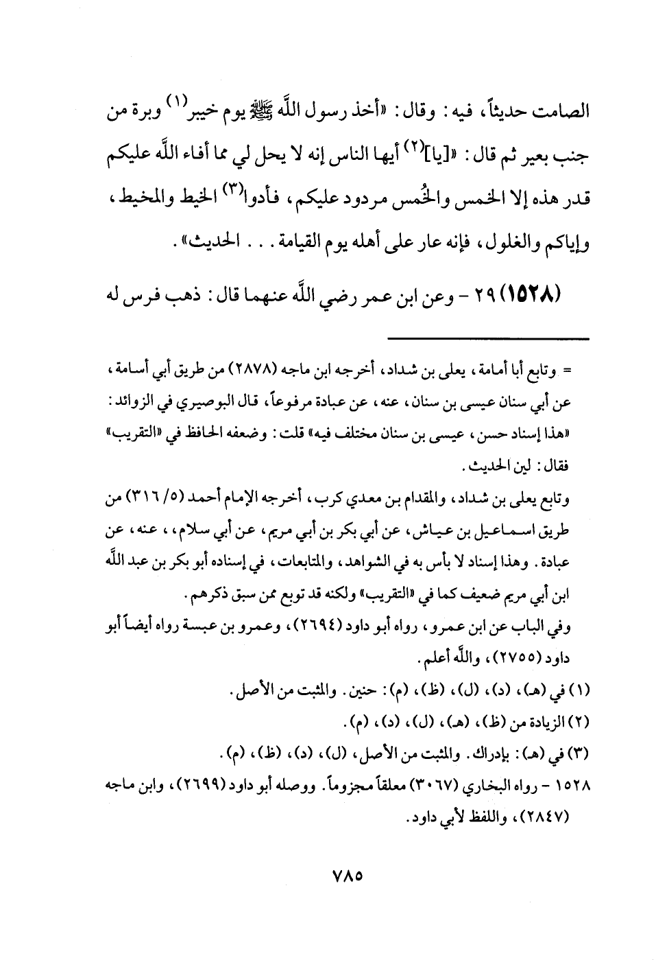الصَّامِت حَدِيثا، فِيهِ: وَقَالَ: " أَخذ رَسُول الله [صَلَّى اللَّهُ عَلَيْهِ وَسَلَّم َ] يَوْم خَيْبَر وبرة من جنب بعير ثمَّ قَالَ: " [يَا] أَيهَا النَّاس إِنَّه لَا يحل لي مِمَّا أَفَاء الله عَلَيْكُم قدر هَذِه إِلَّا الْخمس والخُمس مَرْدُود عَلَيْكُم، فأدوا الْخَيط والمخيط، وَإِيَّاكُم والغلول، فَإِنَّهُ عَار عَلَى أَهله يَوْم الْقِيَامَة ... الحَدِيث ".