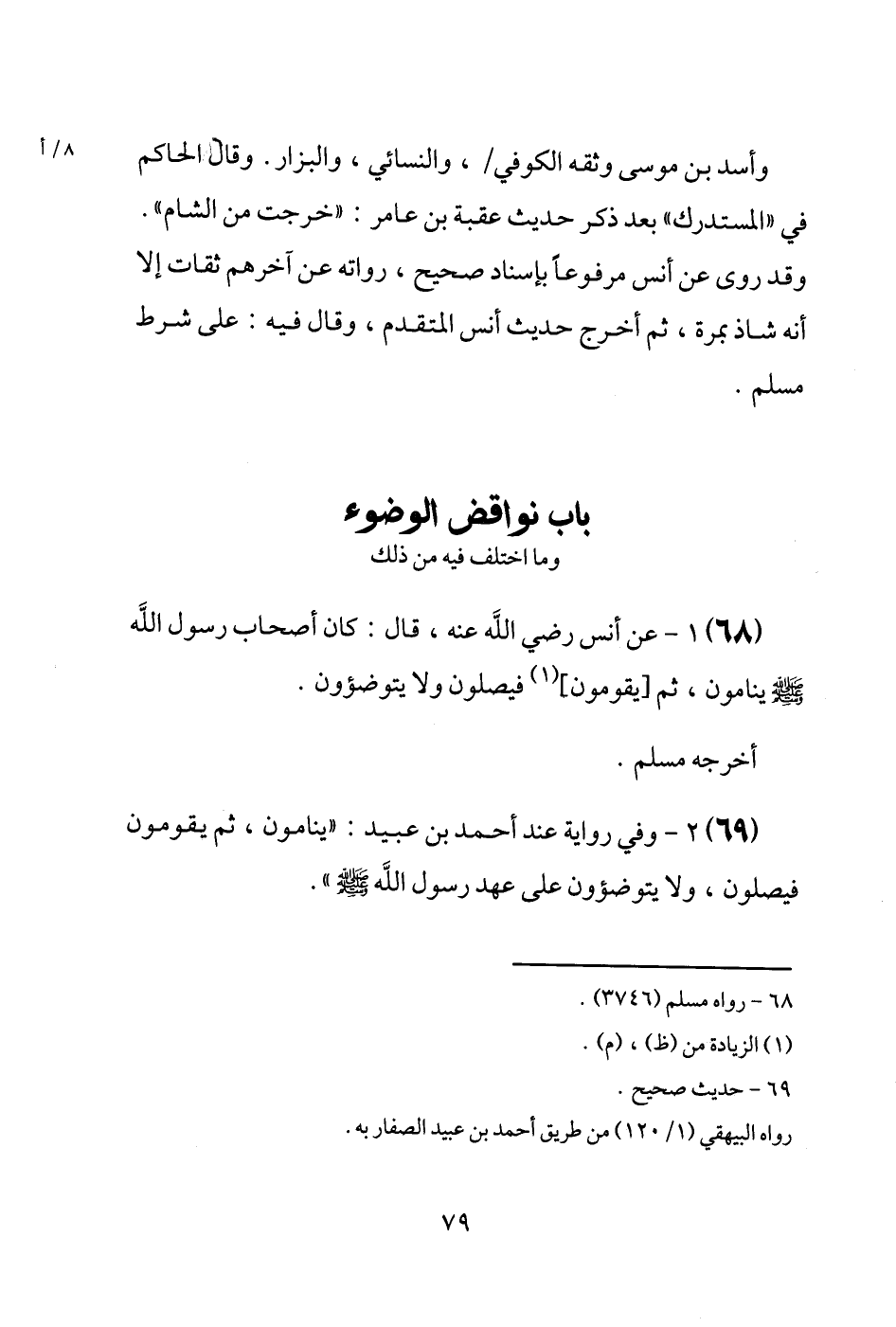 (68) عَن أنس رَضِيَ اللَّهُ عَنْه، قَالَ: كَانَ أَصْحَاب رَسُول الله [صَلَّى اللَّهُ عَلَيْهِ وَسَلَّم َ] ينامون، ثمَّ [يقومُونَ] فيصلون وَلَا يتوضؤون. أخرجه مُسلم.