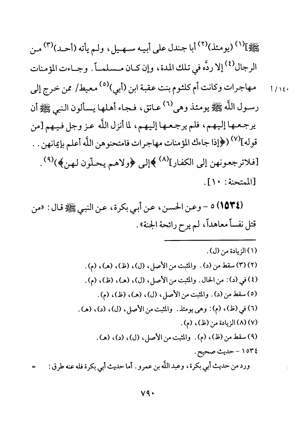 (1534) وَعَن الْحسن، عَن أبي بكرَة، عَن النَّبِي [صَلَّى اللَّهُ عَلَيْهِ وَسَلَّم َ] قَالَ: " من قتل نفسا معاهداً، لم يرح رَائِحَة الْجنَّة ".