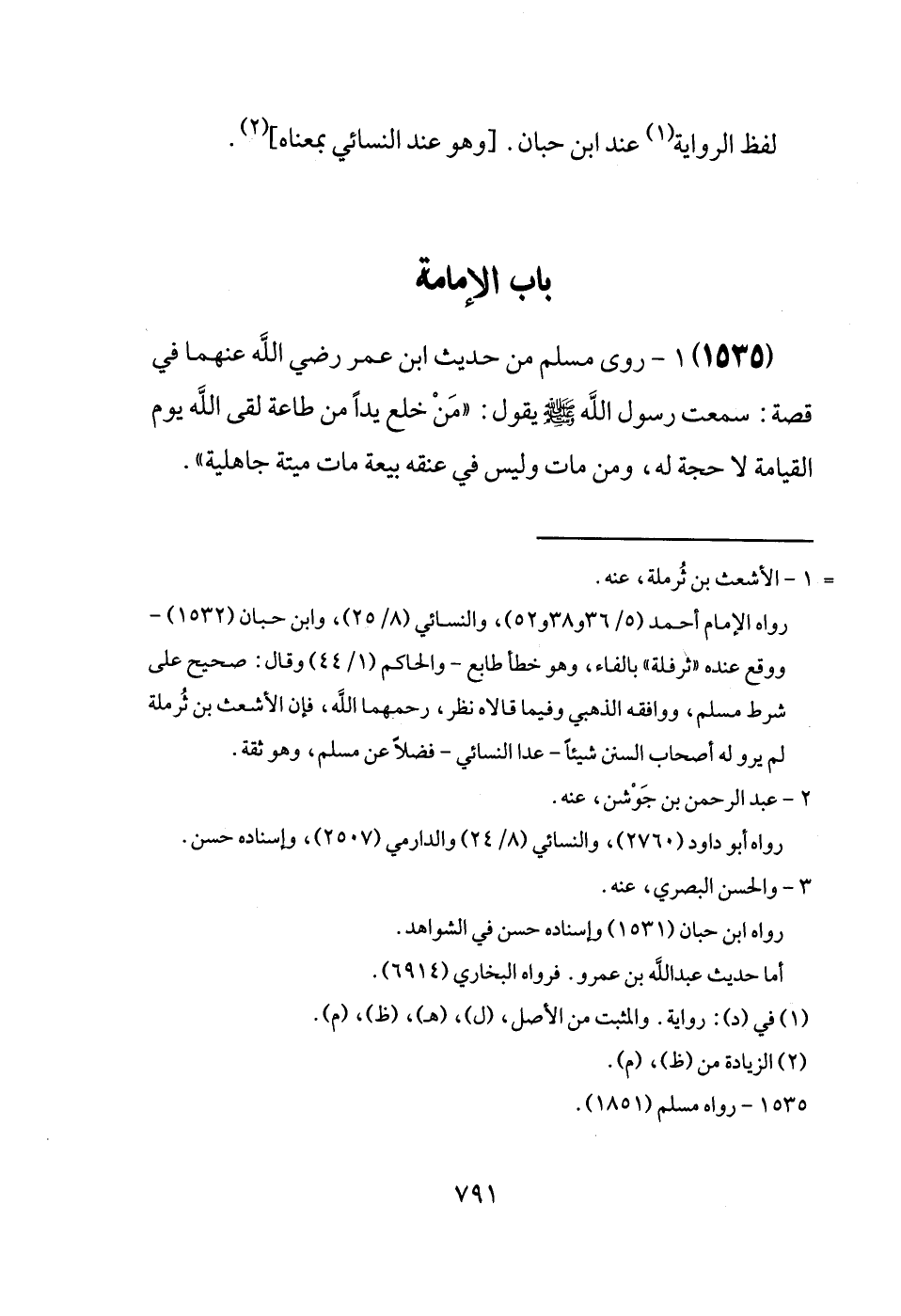 (1535) رَوَى مُسلم من حَدِيث ابْن عمر رَضِيَ اللَّهُ عَنْهما فِي قصَّة: سَمِعت رَسُول الله [صَلَّى اللَّهُ عَلَيْهِ وَسَلَّم َ] يَقُول: " مَنْ خلع يدا من طَاعَة لَقِي الله يَوْم الْقِيَامَة لَا حجَّة لَهُ، وَمن مَاتَ وَلَيْسَ فِي عُنُقه بيعَة مَاتَ ميتَة جَاهِلِيَّة ".