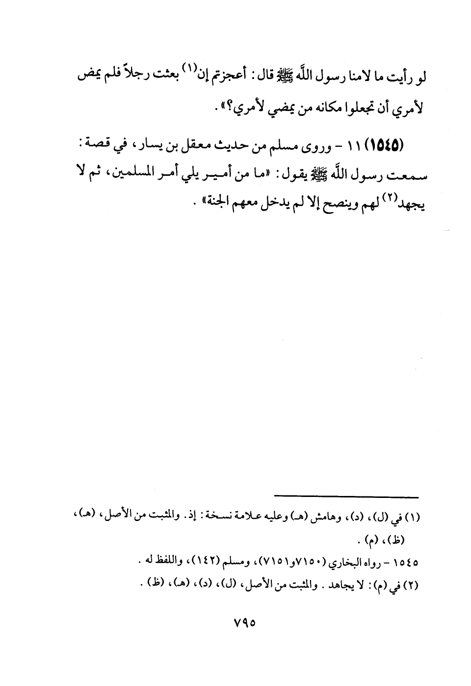 (1545) وَرَوَى مُسلم من حَدِيث معقل بن يسَار، فِي قصَّة: سَمِعت رَسُول الله [صَلَّى اللَّهُ عَلَيْهِ وَسَلَّم َ] يَقُول: " مَا من أَمِير يَلِي أَمر الْمُسلمين، ثمَّ لَا يجْهد لَهُم وَينْصَح إِلَّا لم يدْخل مَعَهم الْجنَّة ".
