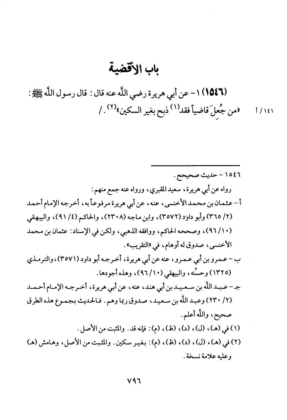 (1546) عَن أبي هُرَيْرَة رَضِيَ اللَّهُ عَنْه قَالَ: قَالَ رَسُول الله [صَلَّى اللَّهُ عَلَيْهِ وَسَلَّم َ] : " من جُعِلَ قَاضِيا فقد ذبح بِغَيْر السكين ". /