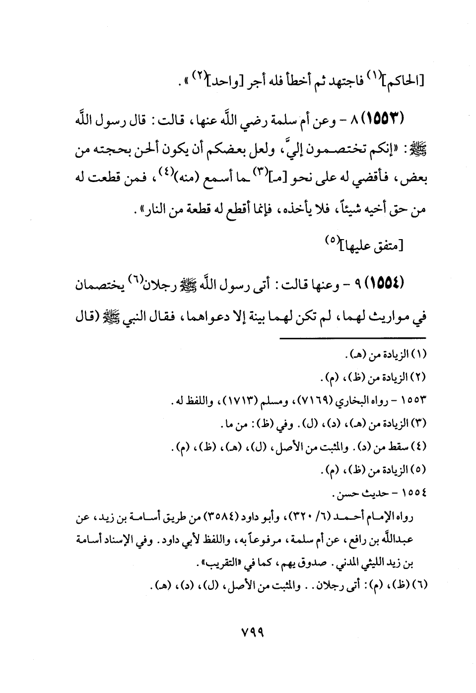 (1553) وَعَن أم سَلمَة رَضِيَ اللَّهُ عَنْها، قَالَت: قَالَ رَسُول الله [صَلَّى اللَّهُ عَلَيْهِ وَسَلَّم َ] : " إِنَّكُم تختصمون إليَّ، وَلَعَلَّ بَعْضكُم أَن يكون أَلحن بحجته من بعض، فأقضي لَهُ عَلَى نَحْو [م] مَا أسمع (مِنْهُ) ، فَمن قطعت لَهُ من حق أَخِيه شَيْئا، فَلَا يَأْخُذهُ، فَإِنَّمَا أقطع لَهُ قِطْعَة من النَّار ". [مُتَّفق عَلَيْهَا] .