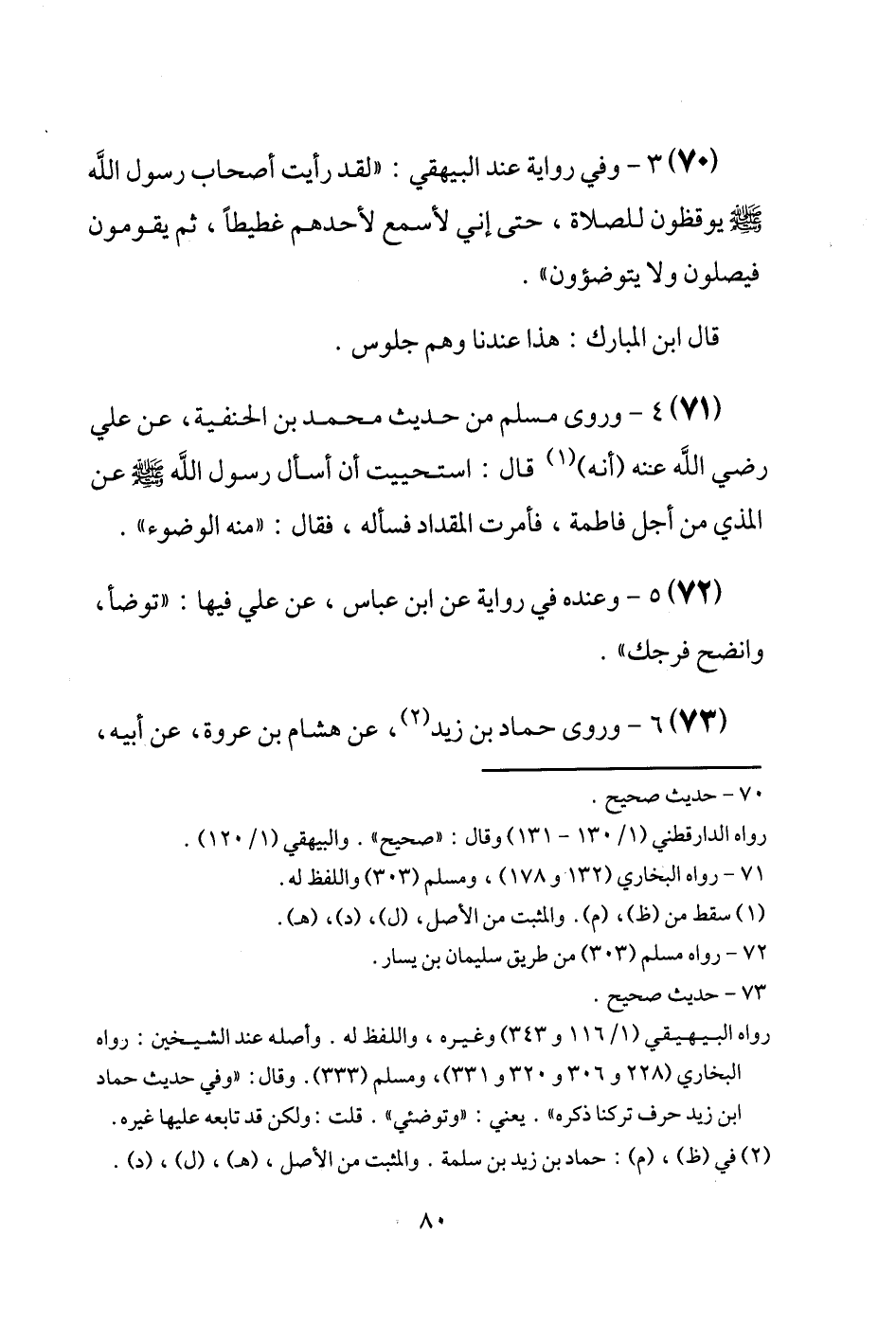 (70) وَفِي رِوَايَة عِنْد الْبَيْهَقِيّ: " لقد رَأَيْت أَصْحَاب رَسُول الله [صَلَّى اللَّهُ عَلَيْهِ وَسَلَّم َ] يوقظون للصَّلَاة، حَتَّى إِنِّي لأسْمع لأَحَدهم غطيطاً، ثمَّ يقومُونَ فيصلون وَلَا يتوضؤون ". قَالَ ابْن الْمُبَارك: هَذَا عندنَا وهم جُلُوس.