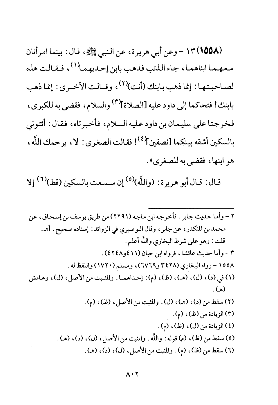 (1558) وَعَن أبي هُرَيْرَة، عَن النَّبِي [صَلَّى اللَّهُ عَلَيْهِ وَسَلَّم َ] ، قَالَ: بَيْنَمَا امْرَأَتَانِ مَعَهُمَا ابناهما، جَاءَ الذِّئْب فَذهب بِابْن إحديهما، فَقَالَت هَذِه لصاحبتها: إِنَّمَا ذهب بابنك (أَنْت) ، وَقَالَت الْأُخْرَى: إِنَّمَا ذهب بابنك! فتحاكما إِلَى دَاوُد عَلَيْهِ [الصَّلَاة] وَالسَّلَام، فَقَضَى بِهِ للكبرى، فخرجتا عَلَى سُلَيْمَان بن دَاوُد عَلَيْهِ السَّلَام، فأخبرتاه، فَقَالَ: أئتوني بالسكين أشقه بَيْنكُمَا [نِصْفَيْنِ] ! فَقَالَت الصُّغْرَى: لَا، يَرْحَمك الله، هُوَ ابْنهَا، فَقَضَى بِهِ للصغرى ". قَالَ: قَالَ أَبُو هُرَيْرَة: (وَالله) إِن سَمِعت بالسكين (قطّ) إِلَّا
