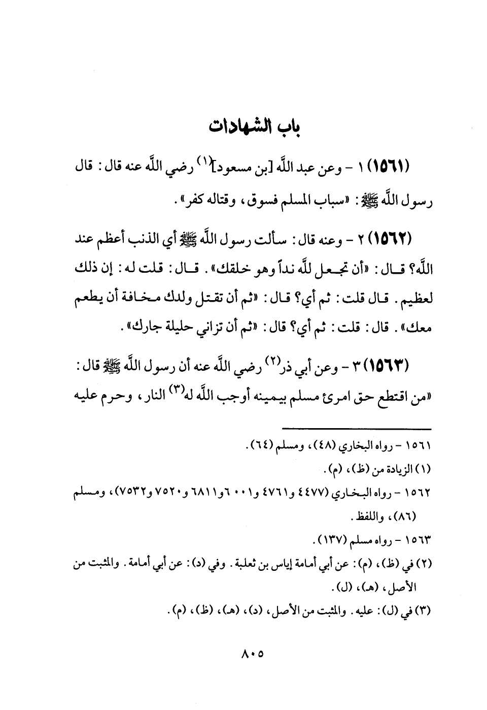 (1561) وَعَن عبد الله [بن مَسْعُود] رَضِيَ اللَّهُ عَنْه قَالَ: قَالَ رَسُول الله [صَلَّى اللَّهُ عَلَيْهِ وَسَلَّم َ] : " سباب الْمُسلم فسوق، وقتاله كفر ".