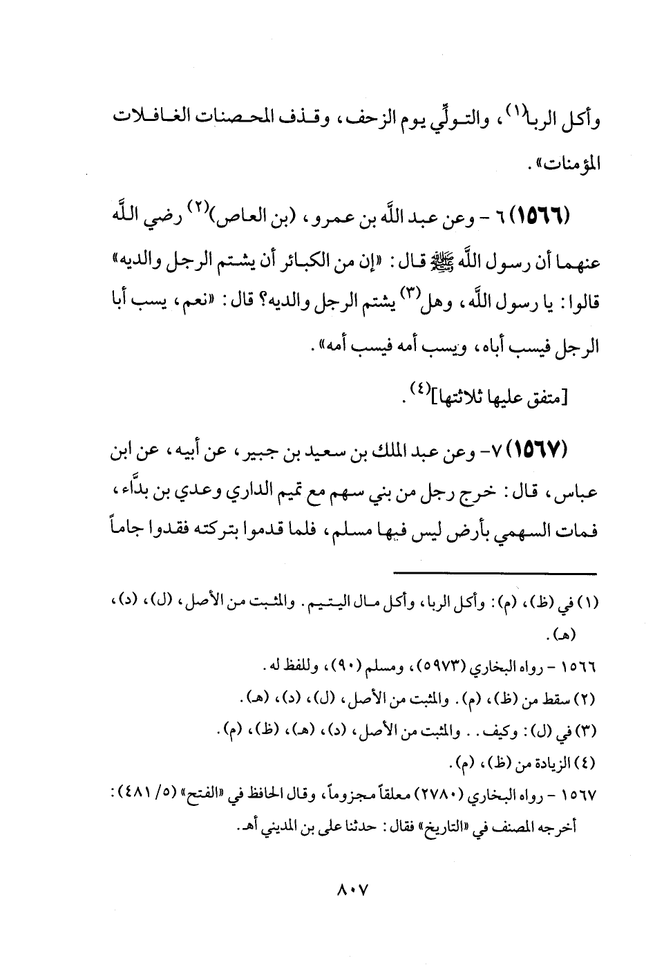 (1566) وَعَن عبد الله بن عَمْرو، (بن الْعَاصِ) رَضِيَ اللَّهُ عَنْهما أَن رَسُول الله [صَلَّى اللَّهُ عَلَيْهِ وَسَلَّم َ] قَالَ: " إِن من الْكَبَائِر أَن يشْتم الرجل وَالِديهِ " قَالُوا: يَا رَسُول الله، وَهل يشْتم الرجل وَالِديهِ؟ قَالَ: " نعم، يسب أَبَا الرجل فيسب أَبَاهُ، ويسب أمه فيسب أمه ". [مُتَّفق عَلَيْهَا ثلاثتها] .