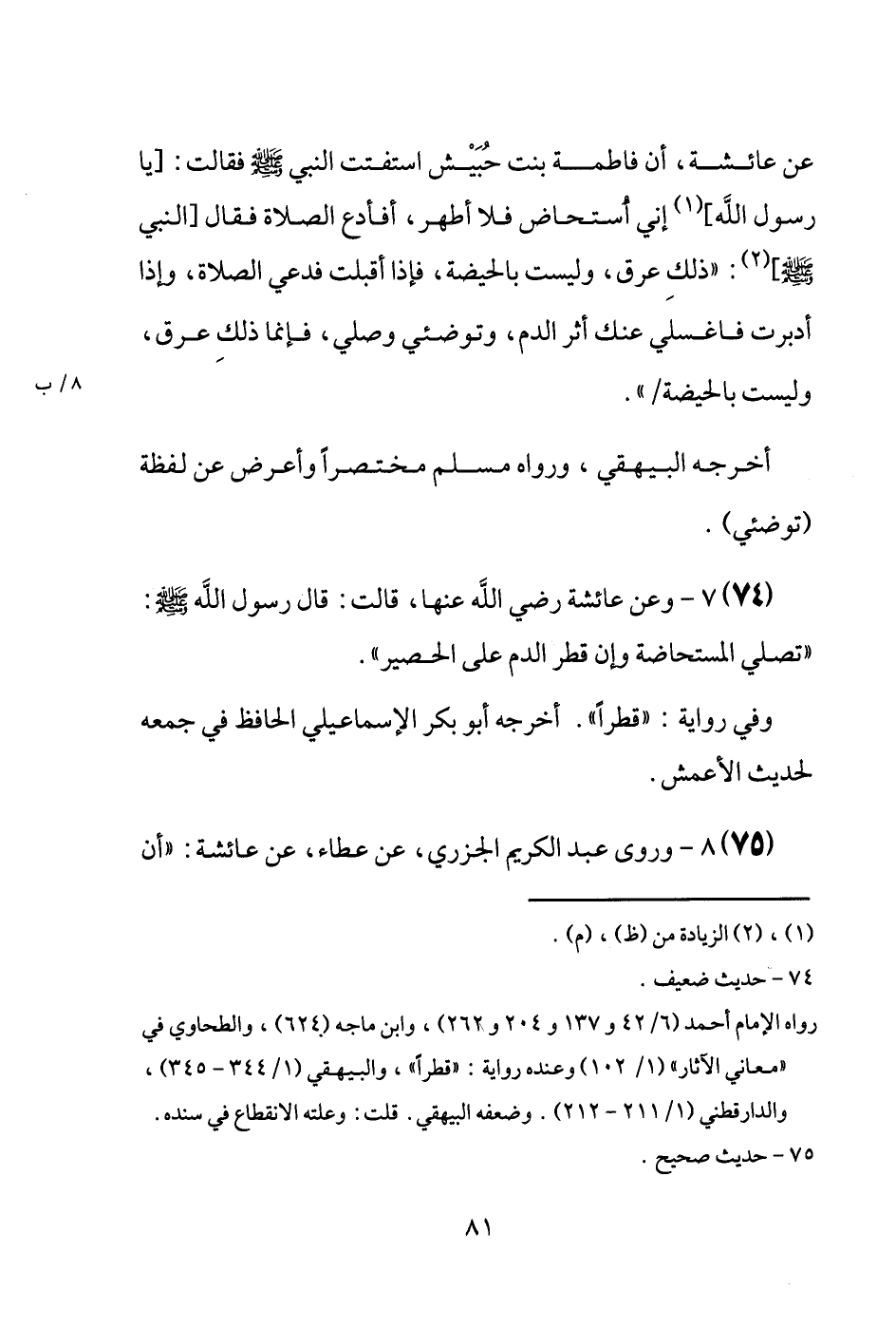 (74) وَعَن عَائِشَة رَضِيَ اللَّهُ عَنْها، قَالَت: قَالَ رَسُول الله [صَلَّى اللَّهُ عَلَيْهِ وَسَلَّم َ] : " تصلي الْمُسْتَحَاضَة وَإِن قطر الدَّم عَلَى الْحَصِير ". وَفِي رِوَايَة: " قطراً ". أخرجه أَبُو بكر الْإِسْمَاعِيلِيّ الْحَافِظ فِي جمعه لحَدِيث الْأَعْمَش.