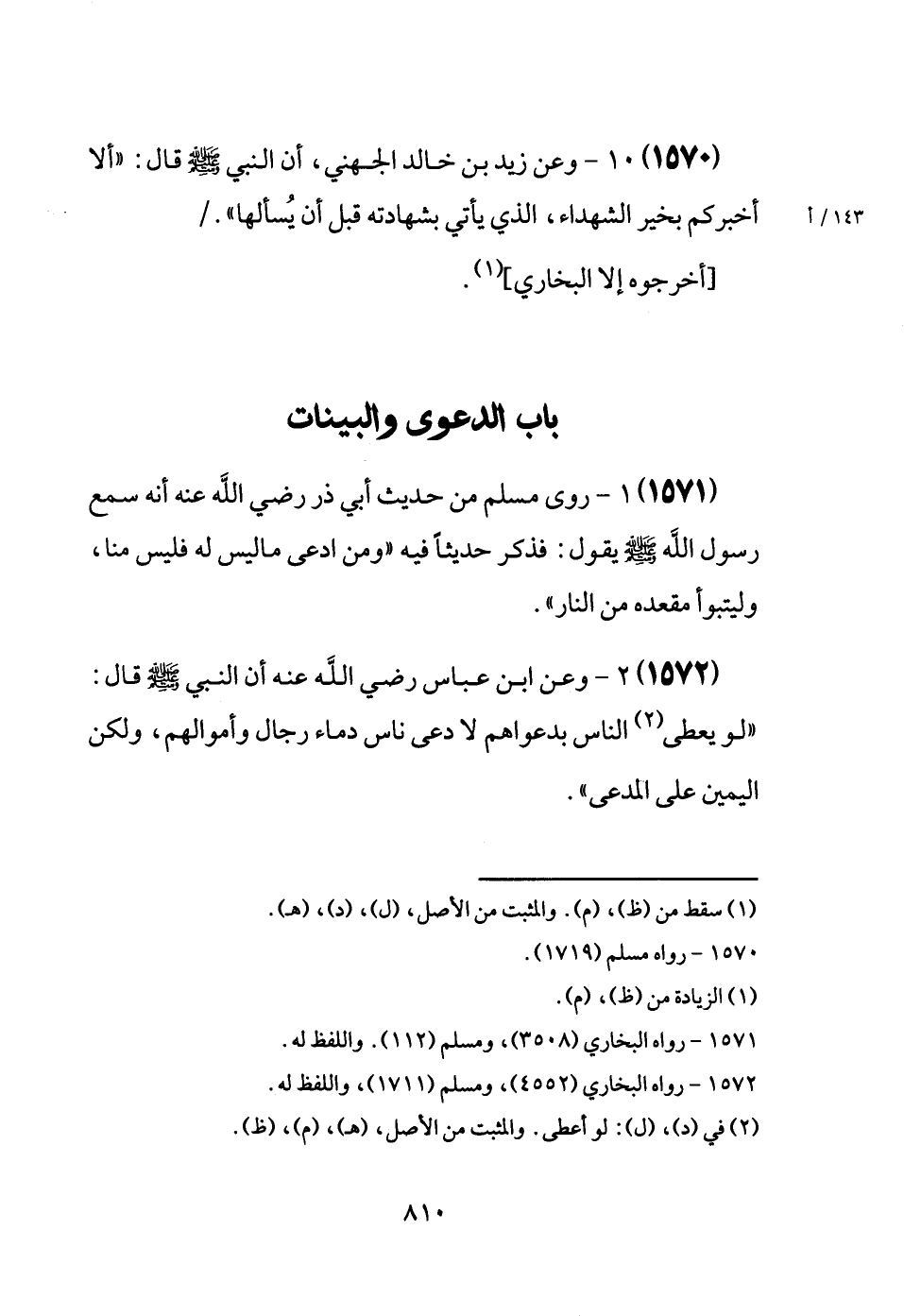 (1572) وَعَن ابْن عَبَّاس رَضِيَ اللَّهُ عَنْه أَن النَّبِي [صَلَّى اللَّهُ عَلَيْهِ وَسَلَّم َ] قَالَ: " لَو يُعْطَى النَّاس بدعواهم لادعى نَاس دِمَاء رجال وَأَمْوَالهمْ، وَلَكِن الْيَمين عَلَى الْمُدَّعِي ".