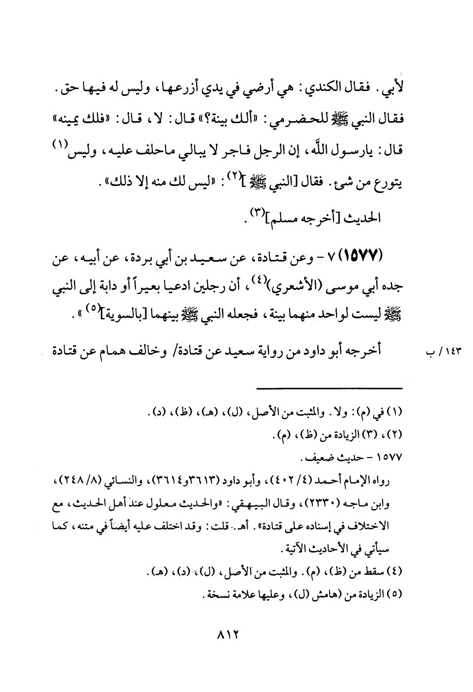 (1577) وَعَن قَتَادَة، عَن سعيد بن أبي بردة، عَن أَبِيه، عَن جده أبي مُوسَى (الْأَشْعَرِيّ) ، أَن رجلَيْنِ ادّعَيَا بَعِيرًا أَو دَابَّة إِلَى النَّبِي [صَلَّى اللَّهُ عَلَيْهِ وَسَلَّم َ] لَيست لوَاحِد مِنْهُمَا بَيِّنَة، فَجعله النَّبِي [صَلَّى اللَّهُ عَلَيْهِ وَسَلَّم َ] بَينهمَا [بِالسَّوِيَّةِ] ". أخرجه أَبُو دَاوُد من رِوَايَة سعيد عَن قَتَادَة / وَخَالف همام عَن قَتَادَة