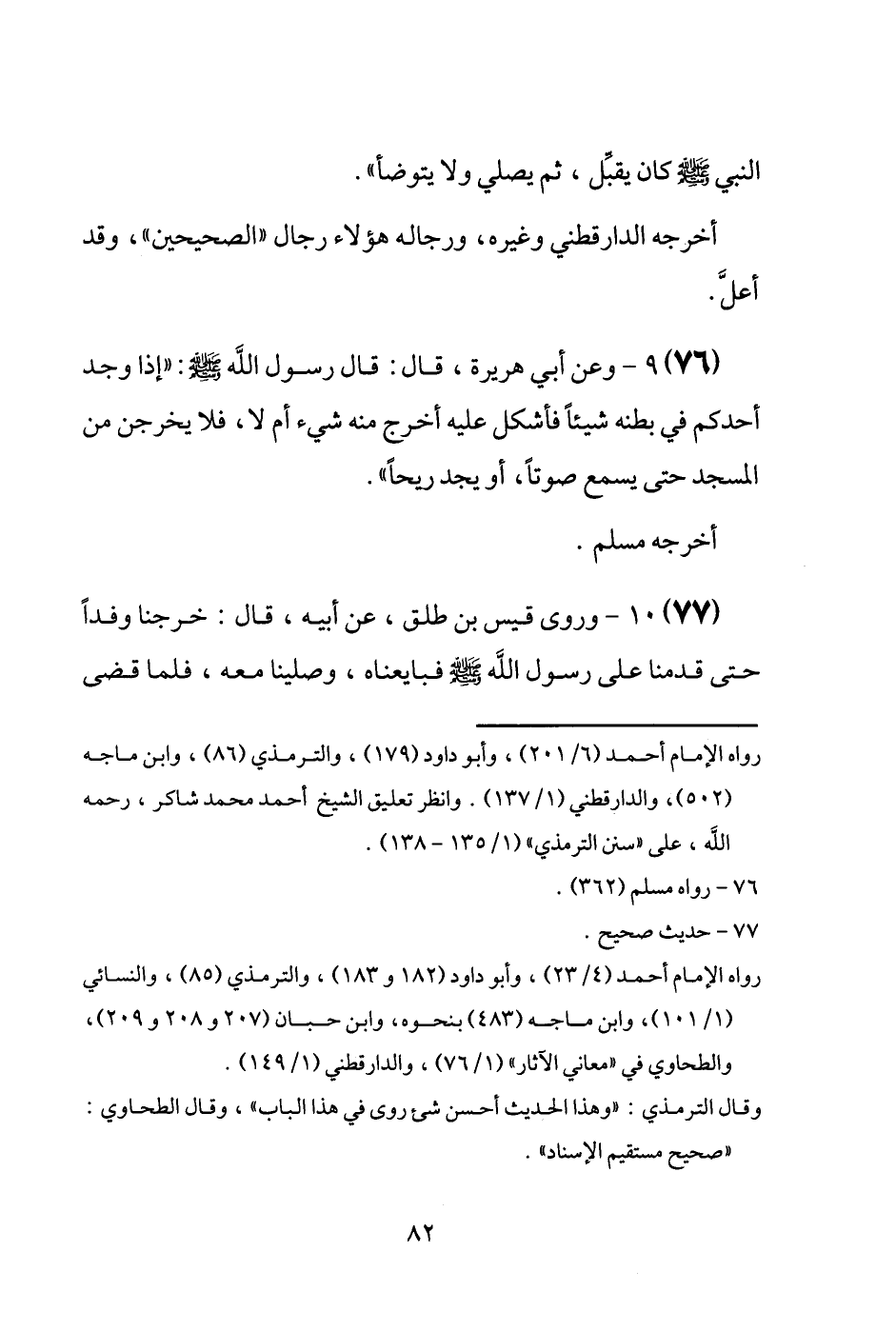 (76) وَعَن أبي هُرَيْرَة، قَالَ: قَالَ رَسُول الله [صَلَّى اللَّهُ عَلَيْهِ وَسَلَّم َ] : " إِذا وجد أحدكُم فِي بَطْنه شَيْئا فأشكل عَلَيْهِ أخرج مِنْهُ شَيْء أم لَا، فَلَا يخْرجن من الْمَسْجِد حَتَّى يسمع صَوتا، أَو يجد ريحًا ". أخرجه مُسلم.