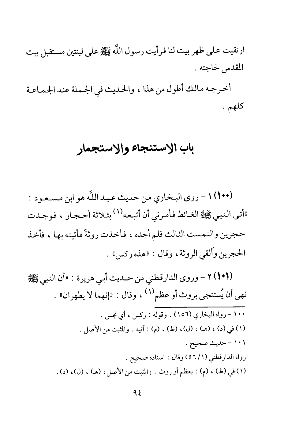 (100) رَوَى البُخَارِيّ من حَدِيث عبد الله هُوَ ابْن مَسْعُود: " أَتَى النَّبِي [صَلَّى اللَّهُ عَلَيْهِ وَسَلَّم َ] الْغَائِط فَأمرنِي أَن أتبعه بِثَلَاثَة أَحْجَار، فَوجدت حجرين والتمست الثَّالِث فَلم أَجِدهُ، فَأخذت رَوْثَة فَأَتَيْته بهَا، فَأخذ الحجرين وَألقَى الروثة، وَقَالَ: " هَذِه ركس ".